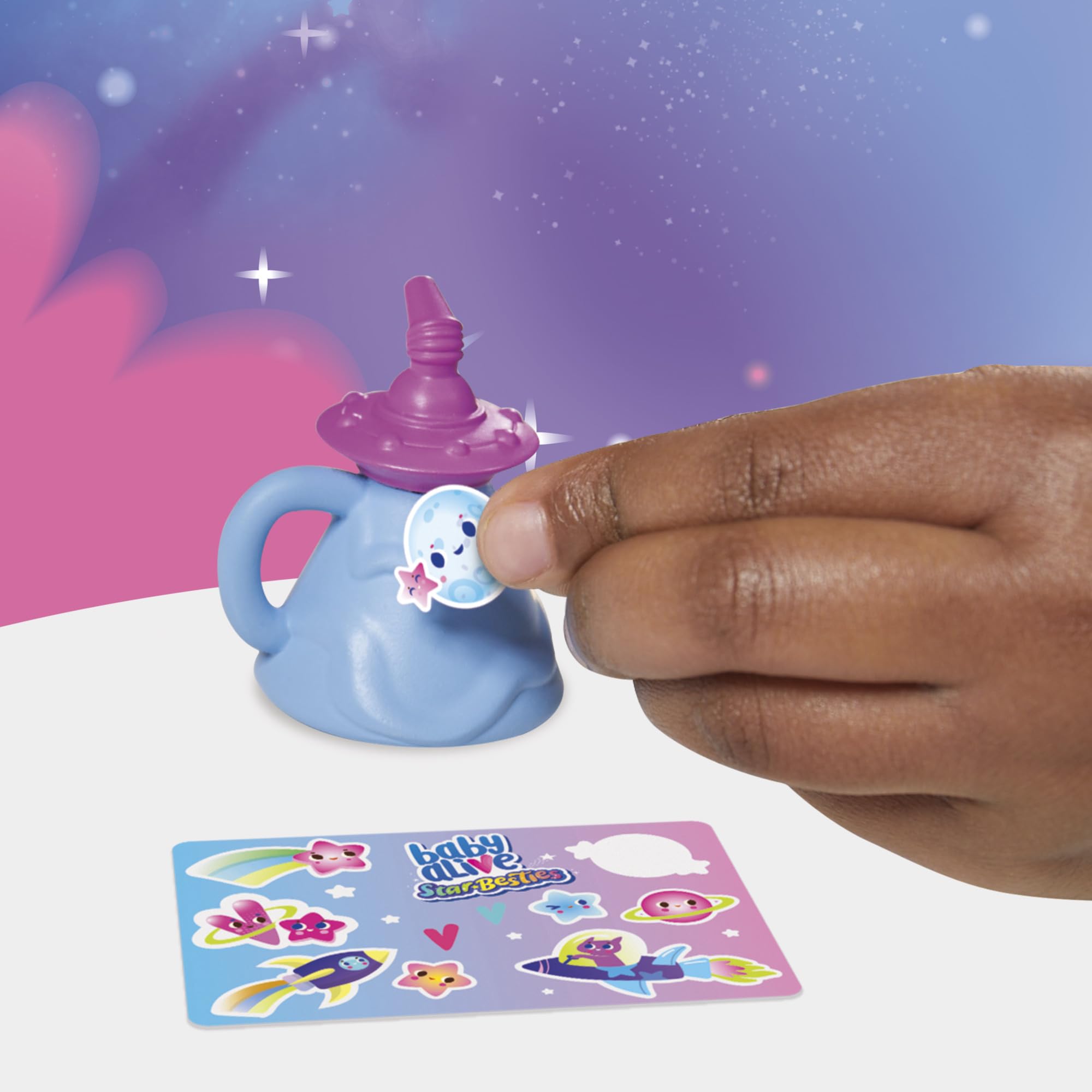 The bestest friends in the whole galaxy! Baby Alive Star Besties Stellar Skylar doll features a sparkly space theme for lots of intergalactic fun. This space-inspired 8-inch Baby Alive doll for 3 year old girls comes with Baby Alive accessories, like a spacey suitcase, planet passport, pretend moon juice drink, comb, and stickers. Her baby doll accessories can even be stored in her suitcase for take-along play! A fantastic gift for girls and boys, this nurturing doll with hair has a star-studded look with a removable foil accent skirt, molded bangs, and a pink and blue brushable ponytail. Collect all of the Star Besties dolls, including Stellar Skylar, Lovely Luna and Bright Bella. (Each doll sold separately. Subject to availability.)
