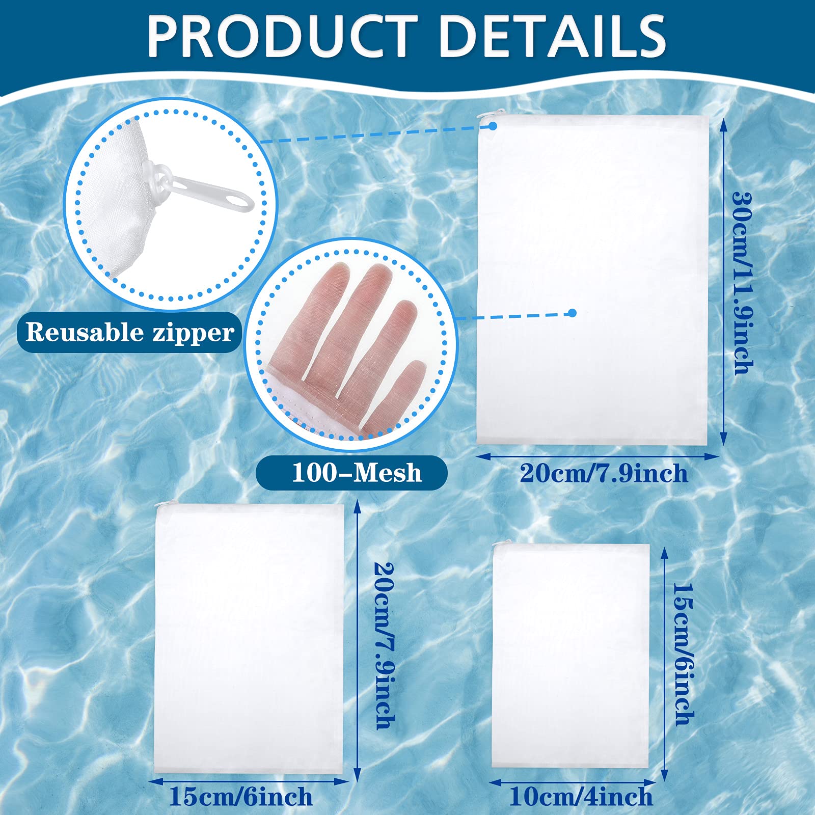 3 Different sizes: you will get totally 15 pieces of 100 mesh aquarium filter bags consisted of 3 different sizes in white color, including 4 pieces small size of 10 x 15 cm/ 4 x 6 inch, 8 pieces medium size of 20 x 15 cm/ 7.9 x 6 inch, and 3 pieces large size of 20 x 30 cm/ 7.9 x 11.8 inch, meet the needs of most aquarium tanks in different usage scenarios