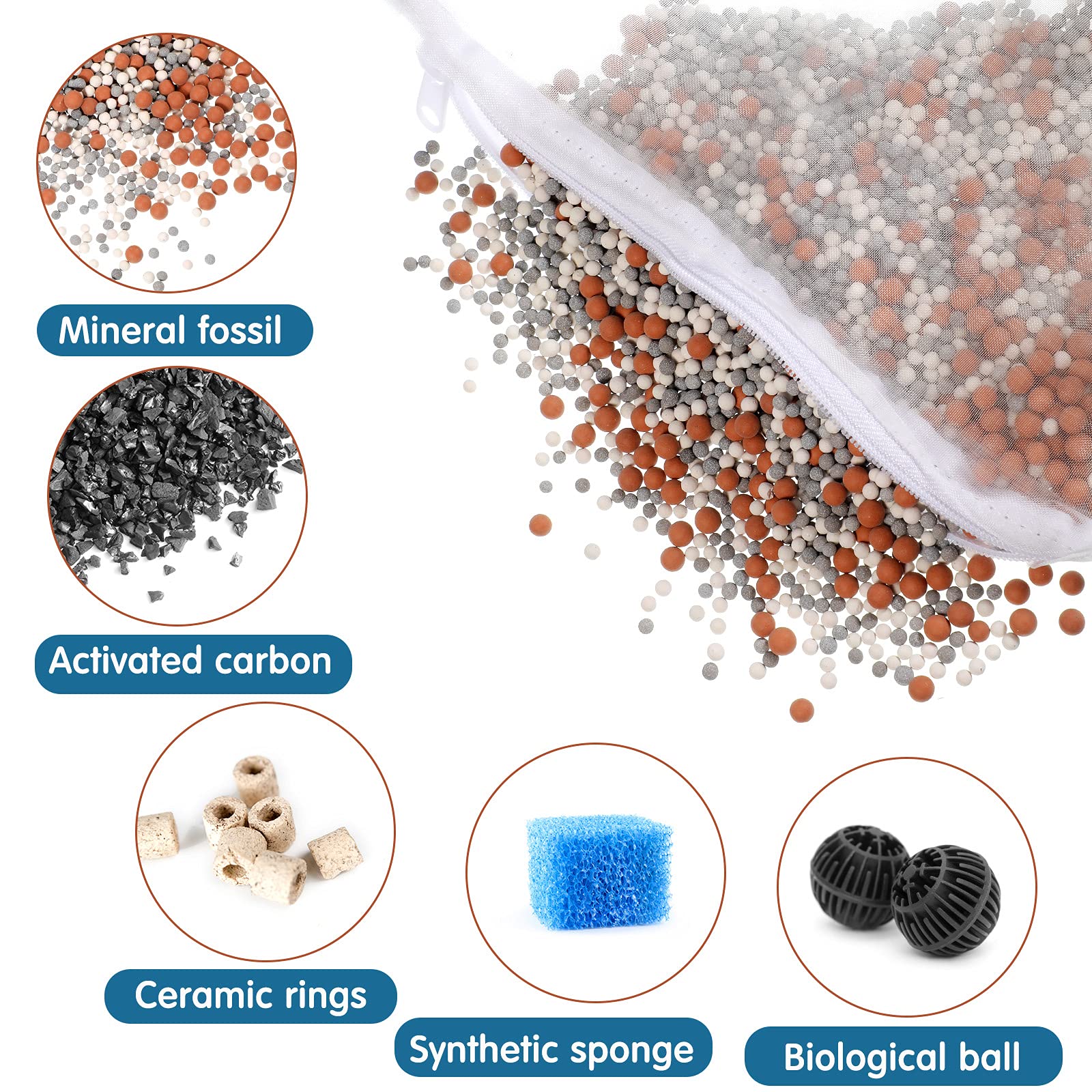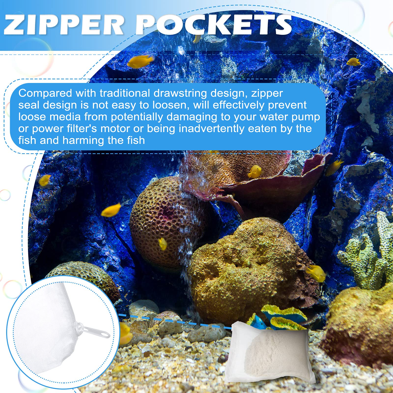 Durable zipper: the fish tank filter bag is designed with a zipper closure at the opening, which is not as easy to loosen, will effectively prevent loose media from potentially damaging to your water pump or power filter's motor or being inadvertently eaten by the fish and harming the fish