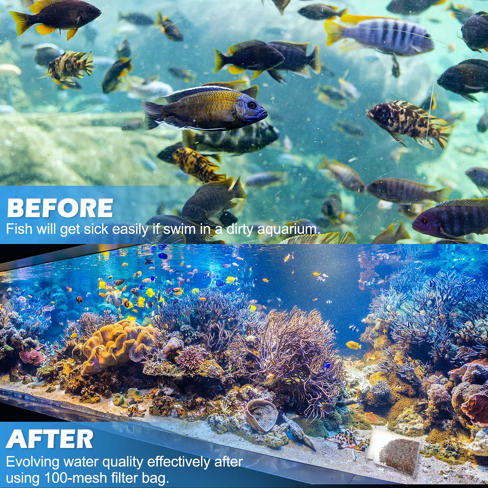 Inclusive usages: the fish tank filter media bag is available for freshwater and saltwater tanks, aquarium, swimming pool, pond and supermarket seafood farming occasions, also suitable for laundrying small things in the washing machine to prevent clothes from tangling