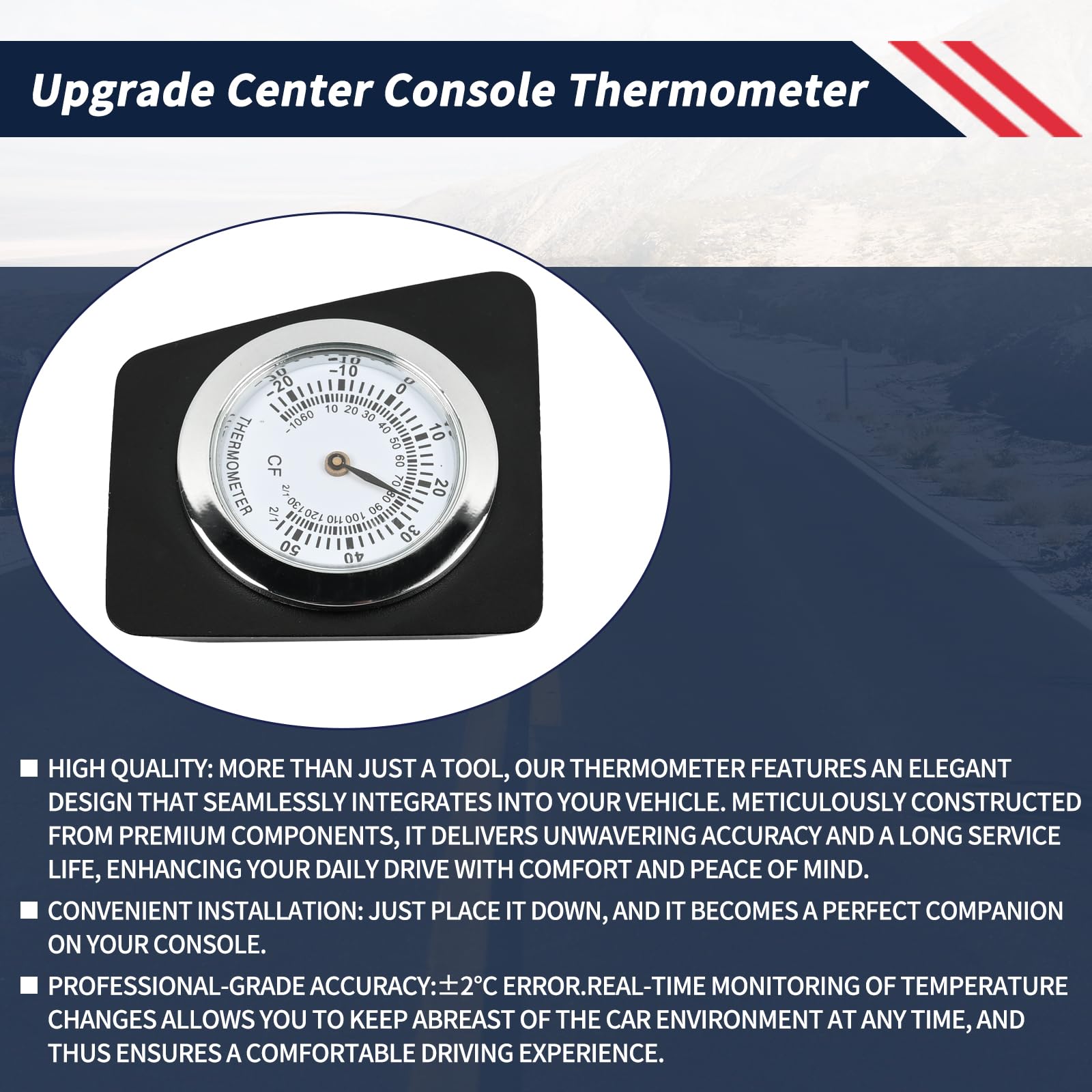 [Convenient Installation]: Your temperature management, made simple. Just place it down, and it becomes a perfect companion on your console. Without any waiting or setup, instantly stay informed about your cabin environment, making every journey more secure.