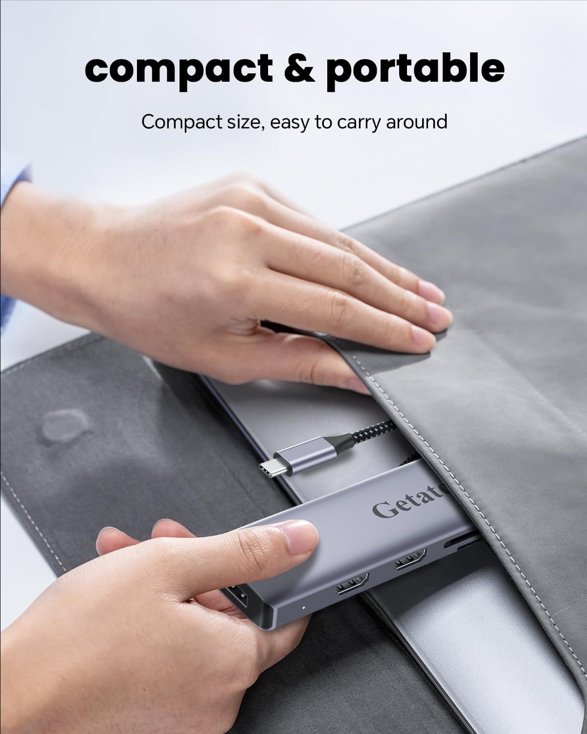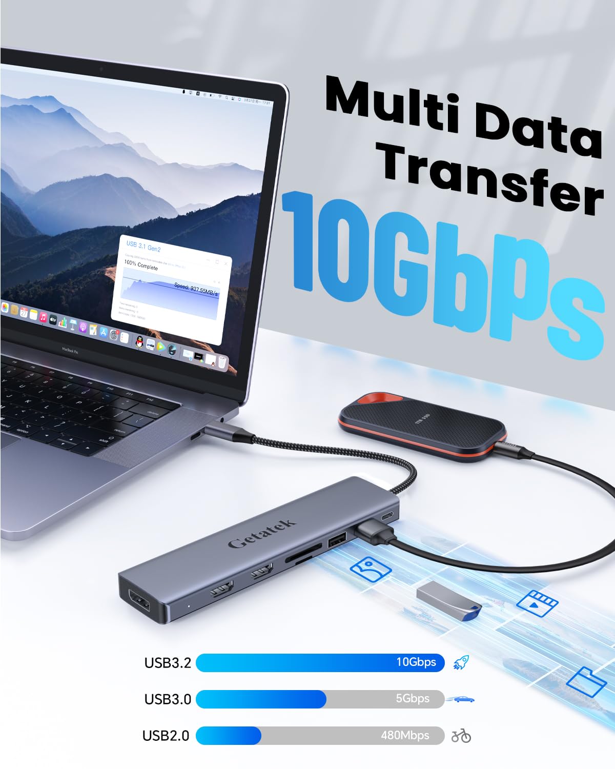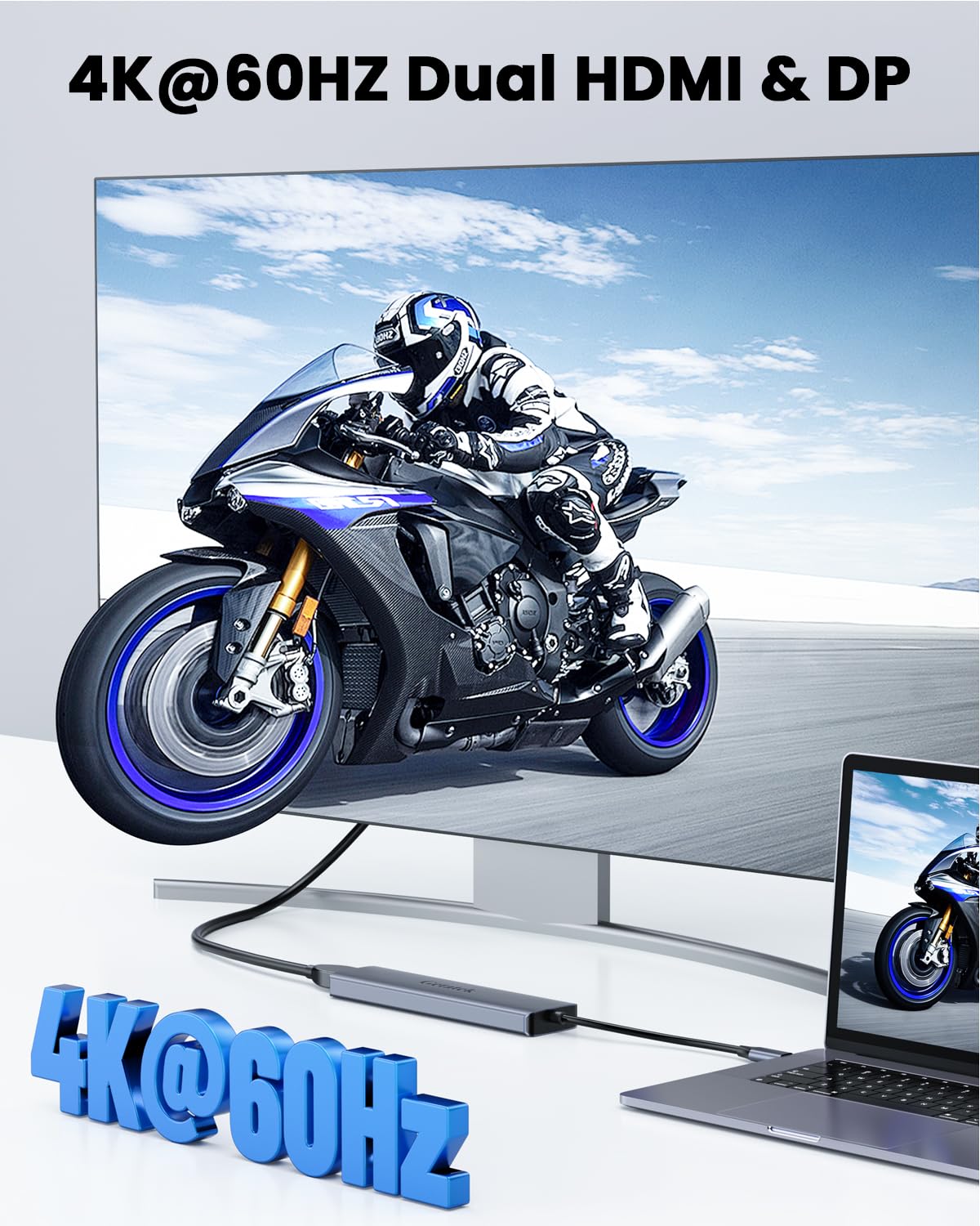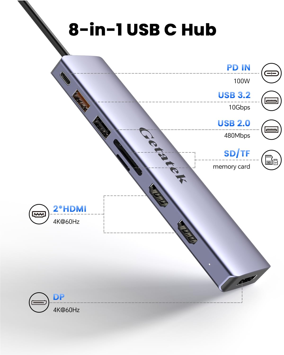 8 in 1 Laptop Docking Station - Plug and play. With this usb c multiple adapter, you will get 2*4K@60HZ Ultra HD HDMI, 1*4K@60HZ Ultra DP display port,100W PD charging port, 1 USB A 3.2(10Gbps), 1*USB A 2.0, SD/TF card reader.