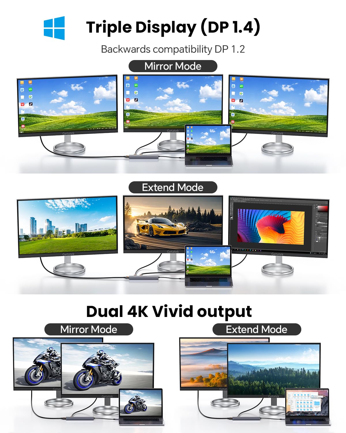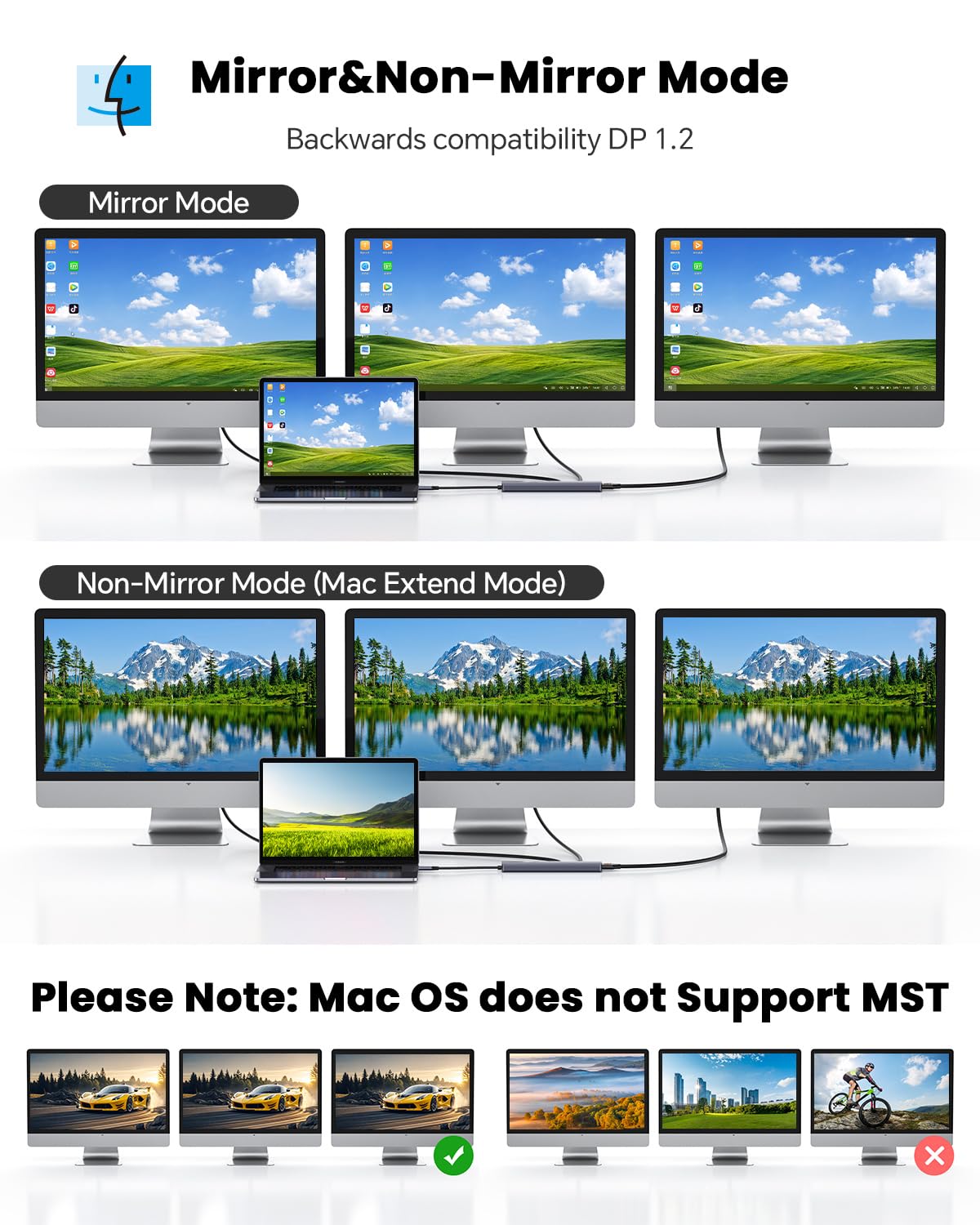 Docking Station 3 Monitors - This usb c docking station only Windows System support Mirror & Extend Mode, HDMI and display port support up to 4K@60Hz. For Extend mode, MAC OS can Only Extend One Monitor (4K@60Hz).