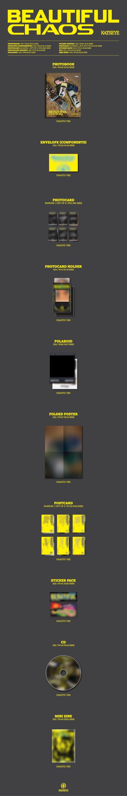 KATSEYE's 2nd EP, BEAUTIFUL CHAOS, via HYBE x Geffen Records, embraces the key message of "celebrating confusion." By incorporating a wide range of genres, the EP goes beyond any boundaries, expressing the chaos in various creative that comes with pushing the limits as an artist, while portraying KATSEYE's journey of growth. The six members of KATSEYE are: DANIELA (USA); LARA (USA); MANON (Switzerland); MEGAN (USA); SOPHIA (Philippines); and YOONCHAE (South Korea).