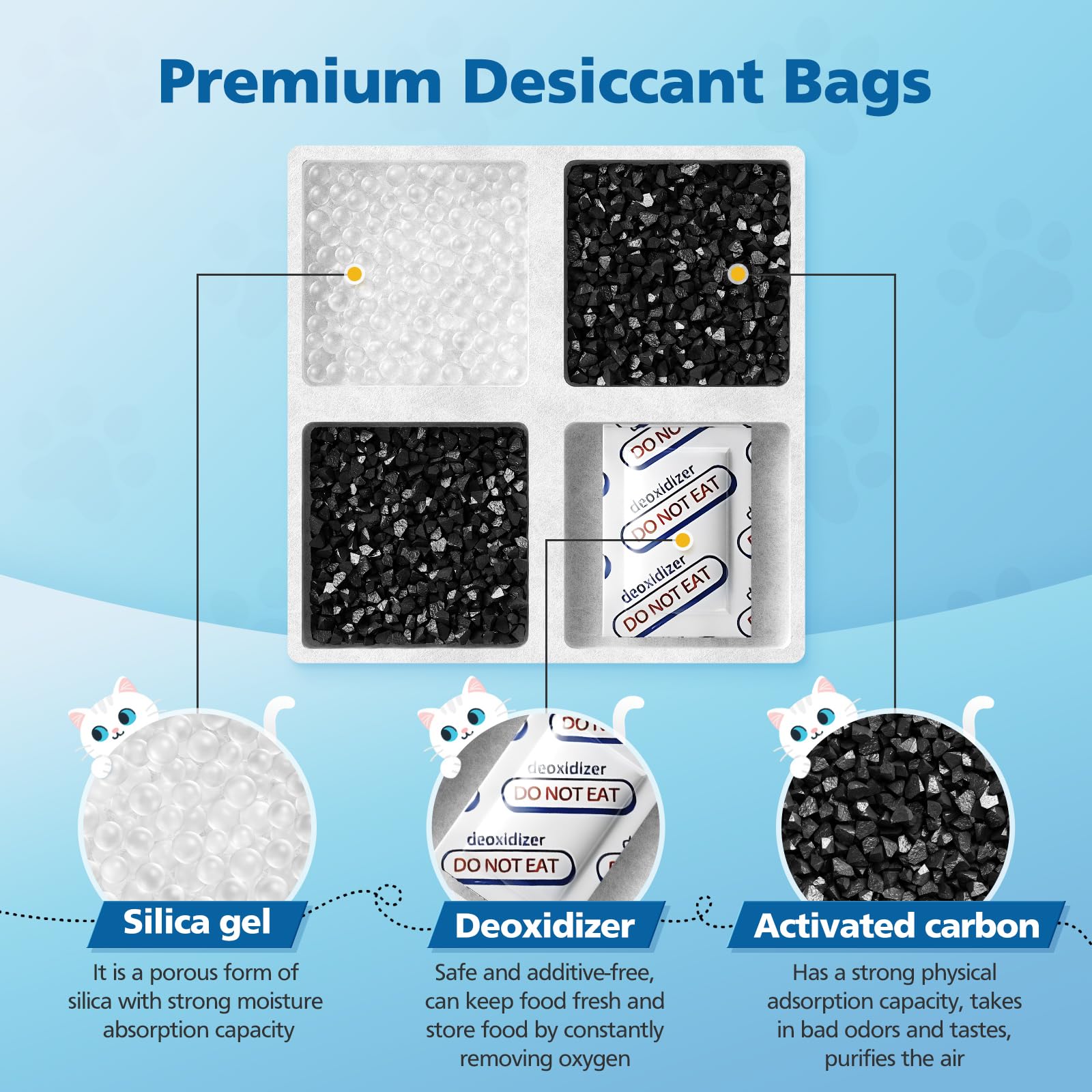 【PREMIUM MATERIAL】: Our pet food desiccant bag is made of non-woven fabric, silica gel, deoxidizer, and activated carbon, which can effectively keep the freshness and dryness of food while minimizing the risk of damage of ingestion by pets. Your pet will love the crispy and fresh-lock food after using our pet food desiccant bag