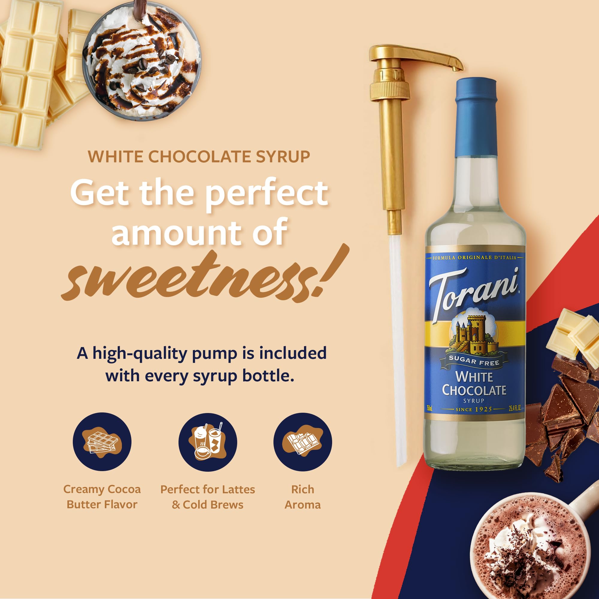 CONVENIENT & MESS-FREE: The large 750 ml Torani Sugar Free White Chocolate Syrup bottle, made of BPA-free plastic, comes with a pump, ensuring mess-free sweetening.