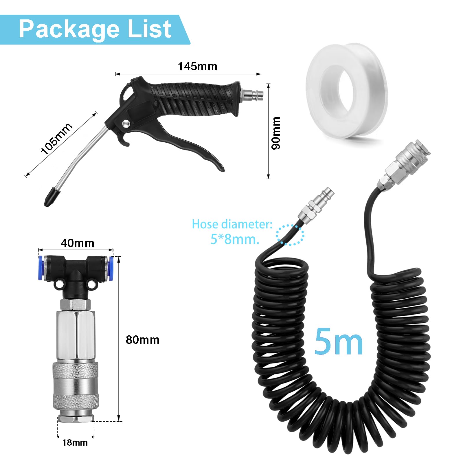 Premium Air Hose: The recoil air hose is made of High quality PU material, Air hose coil OD = 8 mm, which is wear-resistant and durable. It can be stretched to a maximum of 5 meters