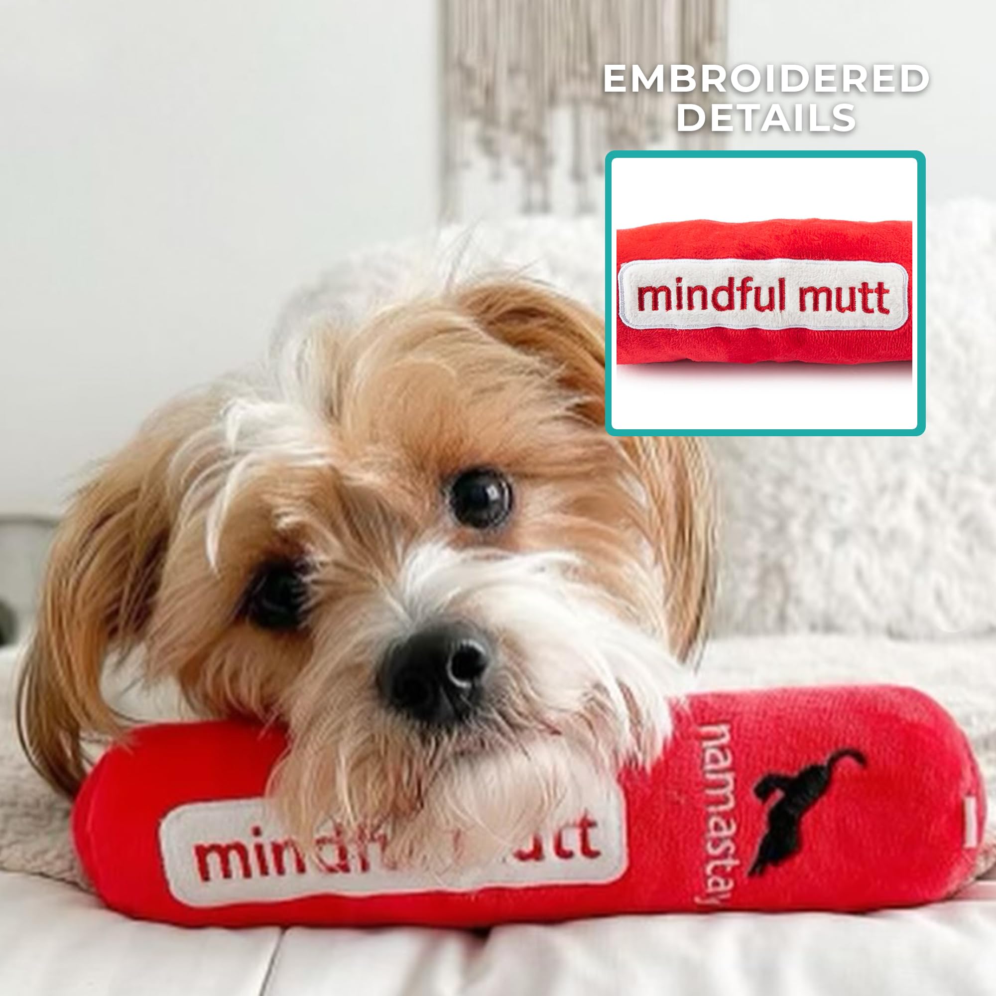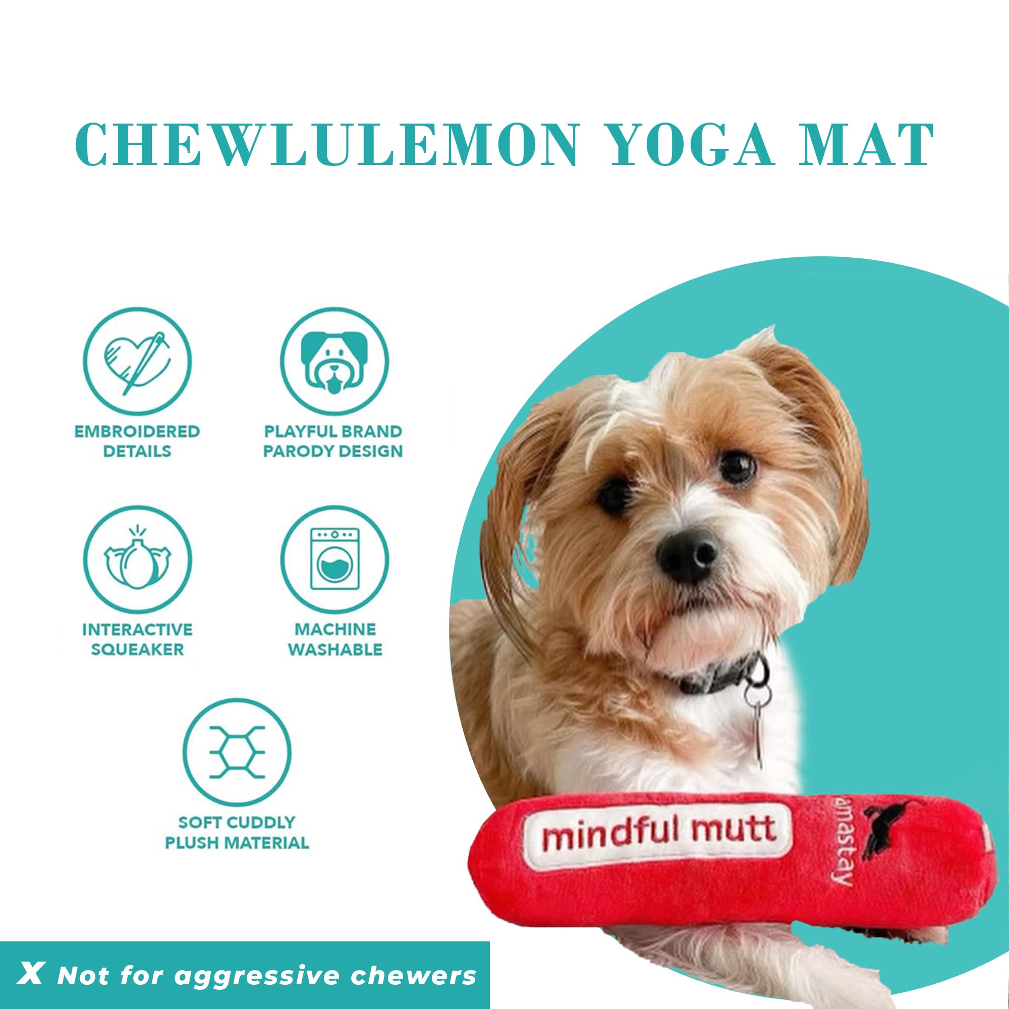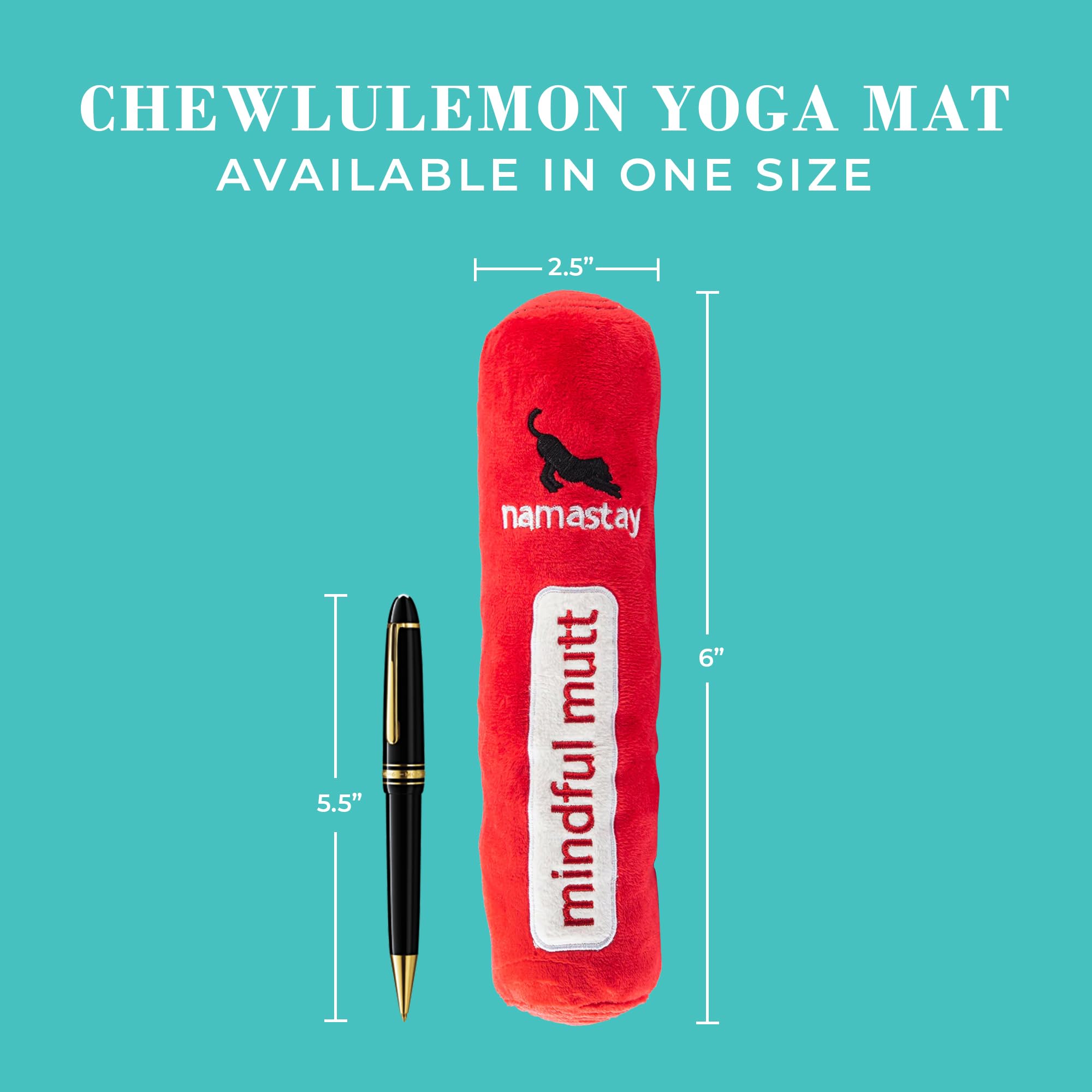 Funny Parody Plush Dog Toy: Treat your furry yogi to some fashion-forward fun with this Chewlulemon Yoga Mat dog toy. Perfect for any dog owner passionate about yoga, it features a bright red plush exterior with black accents and a built-in squeaker hidden inside. It’s a playful, cute interactive dog toy that combines style & fun. One Size 9"x2.5”x2”.