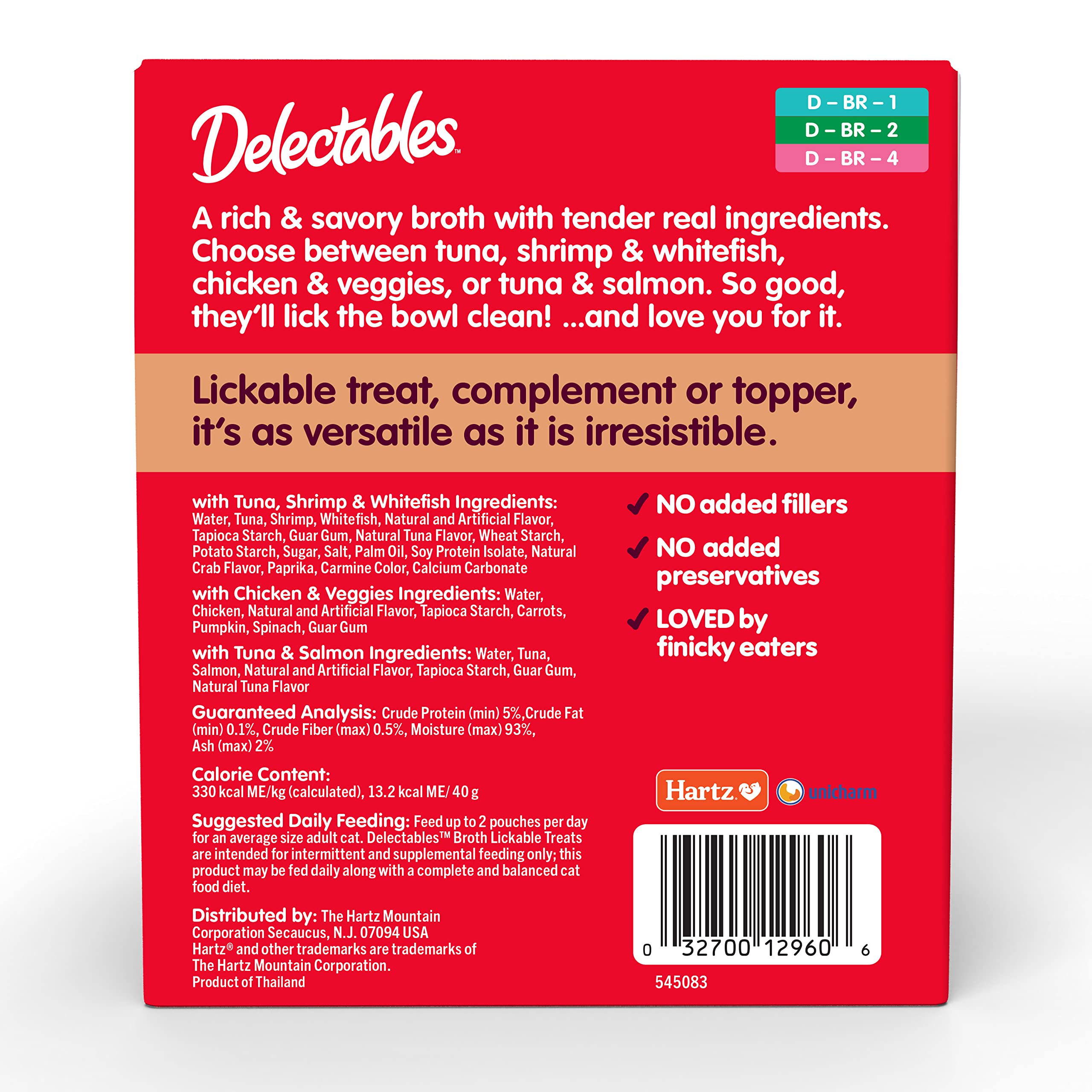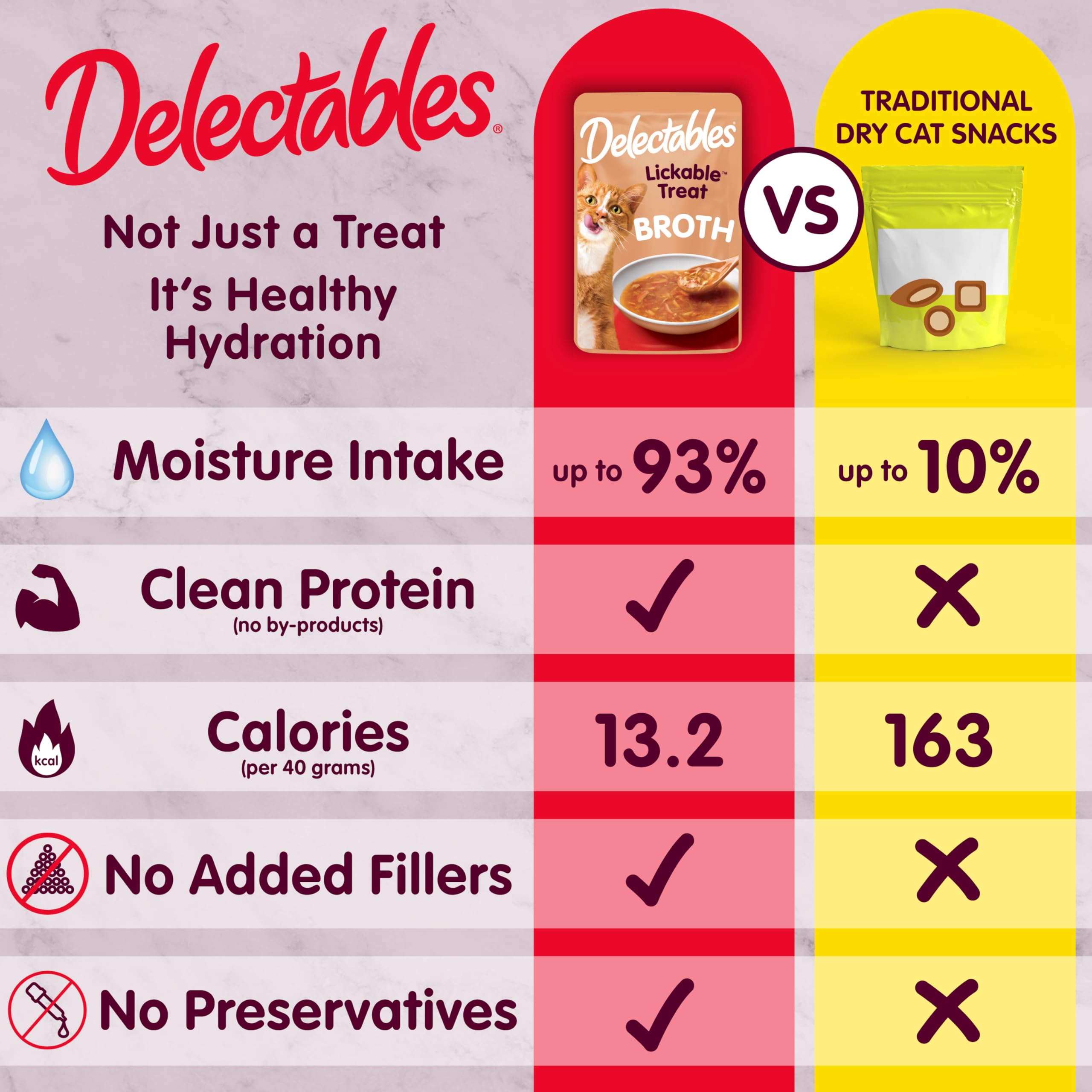 Delectables Lickable Treat Savory Broth features a unique combination of real, tender ingredients in a rich & savory broth that'll have even the pickiest cats meowing for more! Crafted with premium wild-caught tuna, whitefish, salmon, shrimp, and/or cage-free chicken, these treats offer a perfect mix of delicious nutrition and hydration boost. This innovative recipe perfectly blends the sauce and high-quality protein, so your cat can savor every delicious lick without leaving a drop behind. Serve these versatile treats as a tempting food topper, a quick snack, or a special reward. Delectables Lickable Treats are guaranteed to make your cat feel loved and satisfied.