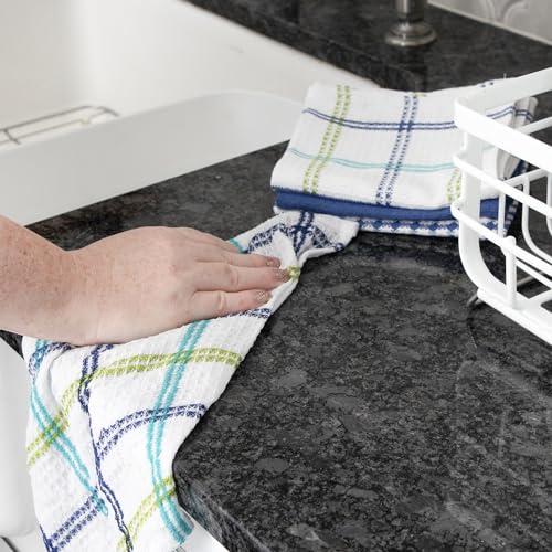 ATTRACTIVE DESIGN. Set includes 4 kitchen dish cloths with vividly colored, coordinating weave design and includes 2 checked pattern kitchen wash cloths, 1 striped kitchen washcloth, and 1 solid-colored scrubbing dish cloth.