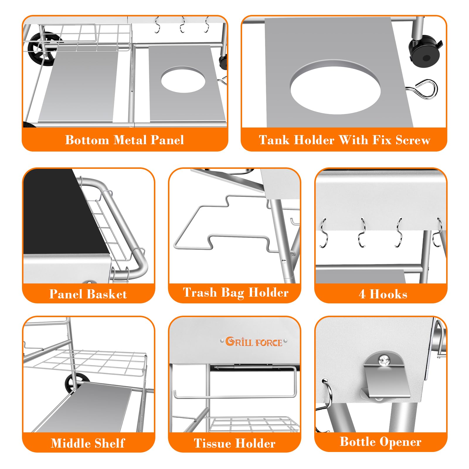 【Sturdy and Durable Construction】The outdoor cooking table is crafted from high-quality metal with a heavy-duty steel bottom shelf and legs, ensuring long-lasting durability.Our grill table is more durable, and not easy to deform, or crack compared to plastic and wooden tables, making it suitable for long-term use