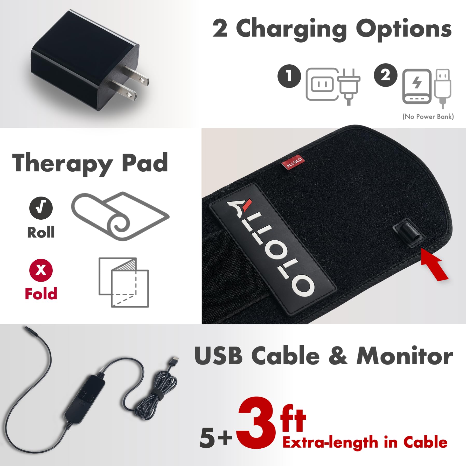 LIGHTWEIGHT AND PORTABLE: ALLOLO Red light belt with soft material is friendly to our skin, comes with a timer controller for 5/10/15/20/25/30 minutes, allowing you to set the duration of your treatment. The near infrared light therapy device is wired and equipped with 2 power supply modes: charger or any mobile power supply. The led infrared light therapy for pain conveniently plugs into the USB port on your power bank, computer, laptop or a charging adapter into a wall outlet. (POWER BANK NOT INCLUDED)