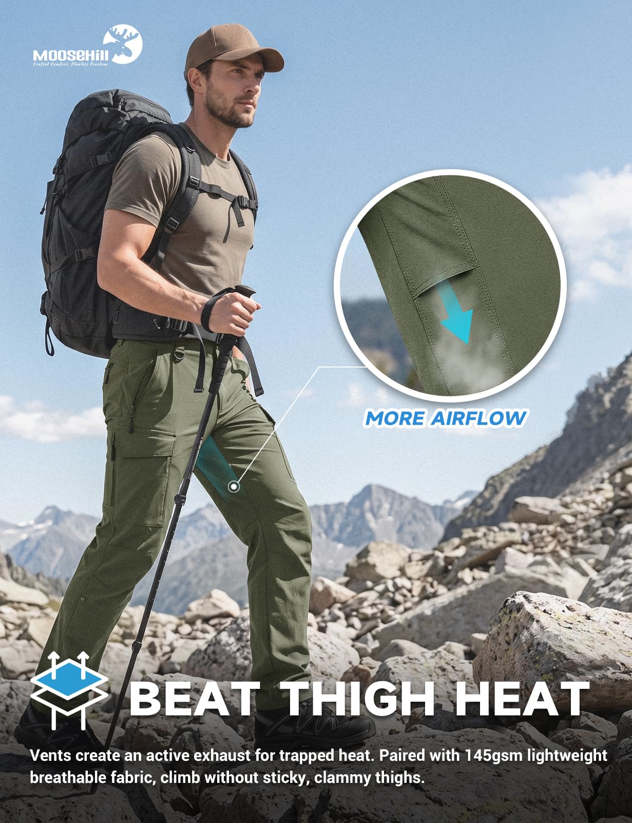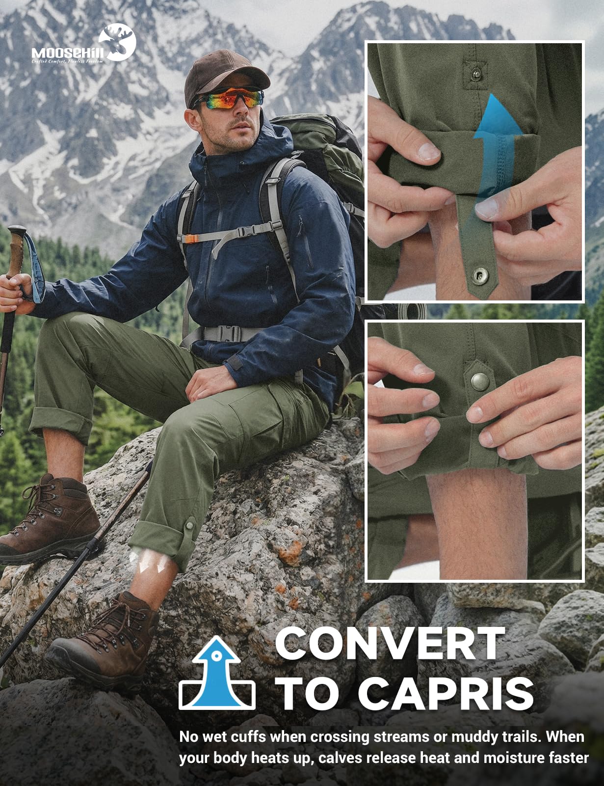 Perfect Air Vents Systems & Easily Transform to Capris Pants: Designed for outdoor enthusiasts like you, these hiking pants for men feature strategically placed breathable vents on the inner thighs, ensuring ventilation and preventing heat buildup in any environment. With the innovative button design at the hem, effortlessly transform them into 7/8 length pants, allowing for easy adaptability to tackle unexpected weather changes or muddy trails with ease.