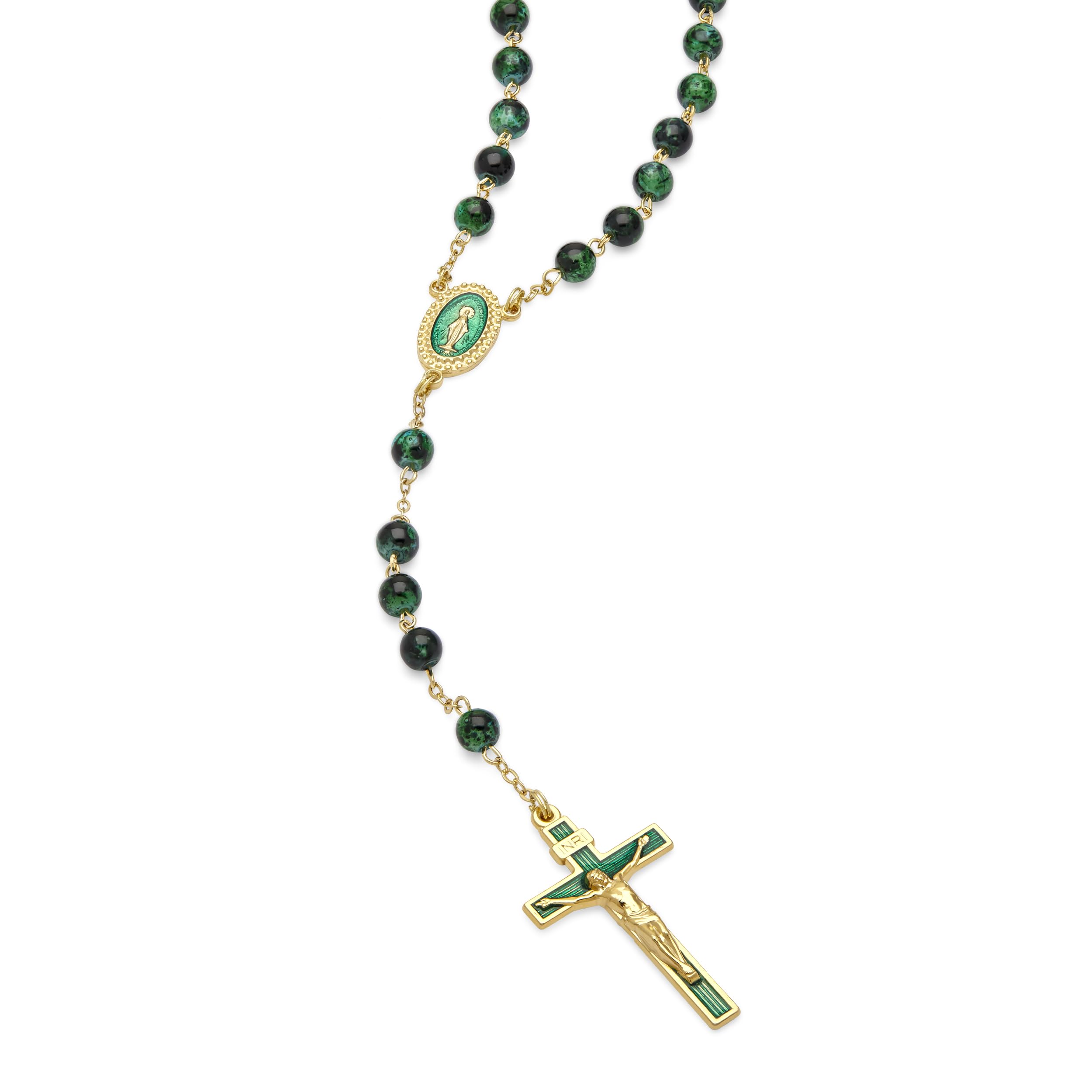 [ππ’ππ’π₯ππ¨π ππ‘π ππππππ‘π§] A colorful and elegant Five-decade gold plated rosary necklace for women with 59 beads. Each of the variegated glass beads is 0.23β in size. The rosary is 18.30β in length. Both the center medal and the crucifix have an enameled greenbackground which perfectly matches the color of the beads. The chain is made from gold-plated brass.