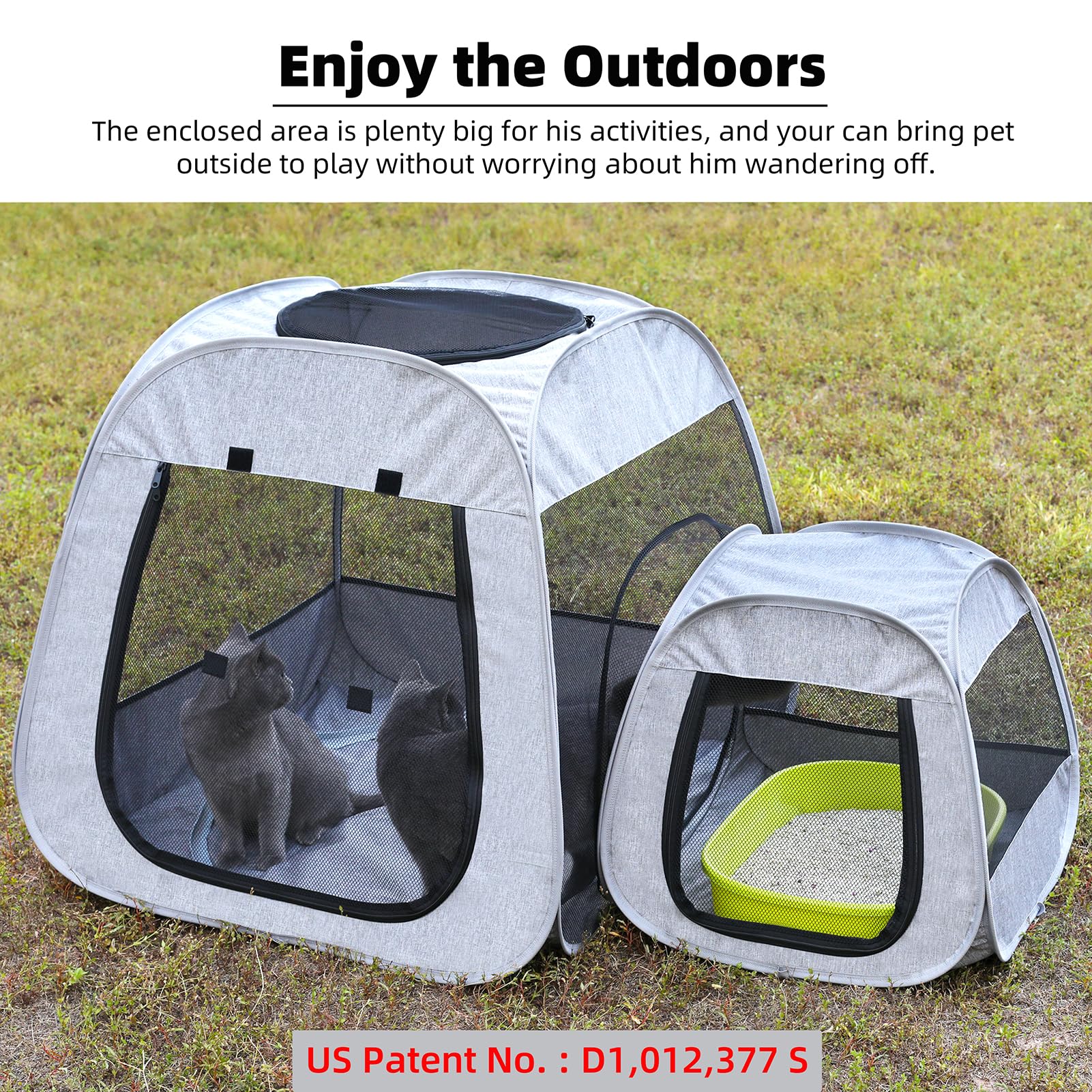 Light Weigh & Portable: When you go camping with your dogs and cat. In the evenings when your sit outside had to be on a leash. Now he has he own space to enjoy his time outside without a harness and leash. The playpen is well made, light weight and folds up so it takes up very little space...perfect for camping. The bottom is removable so gets to have his feet in the grass, sand, etc.