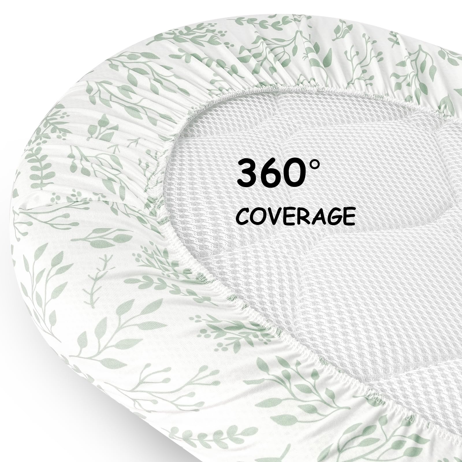Quick & Silent Installation: Featuring SnugFit technology, our bassinet mattress sheets is crafted from stretchy fabric, making it easy to install and remove. The securely stitched elastic edges ensure a snug fit, allowing parents to quickly change sheets during late-night diaper leaks or spit-ups with minimal fuss.