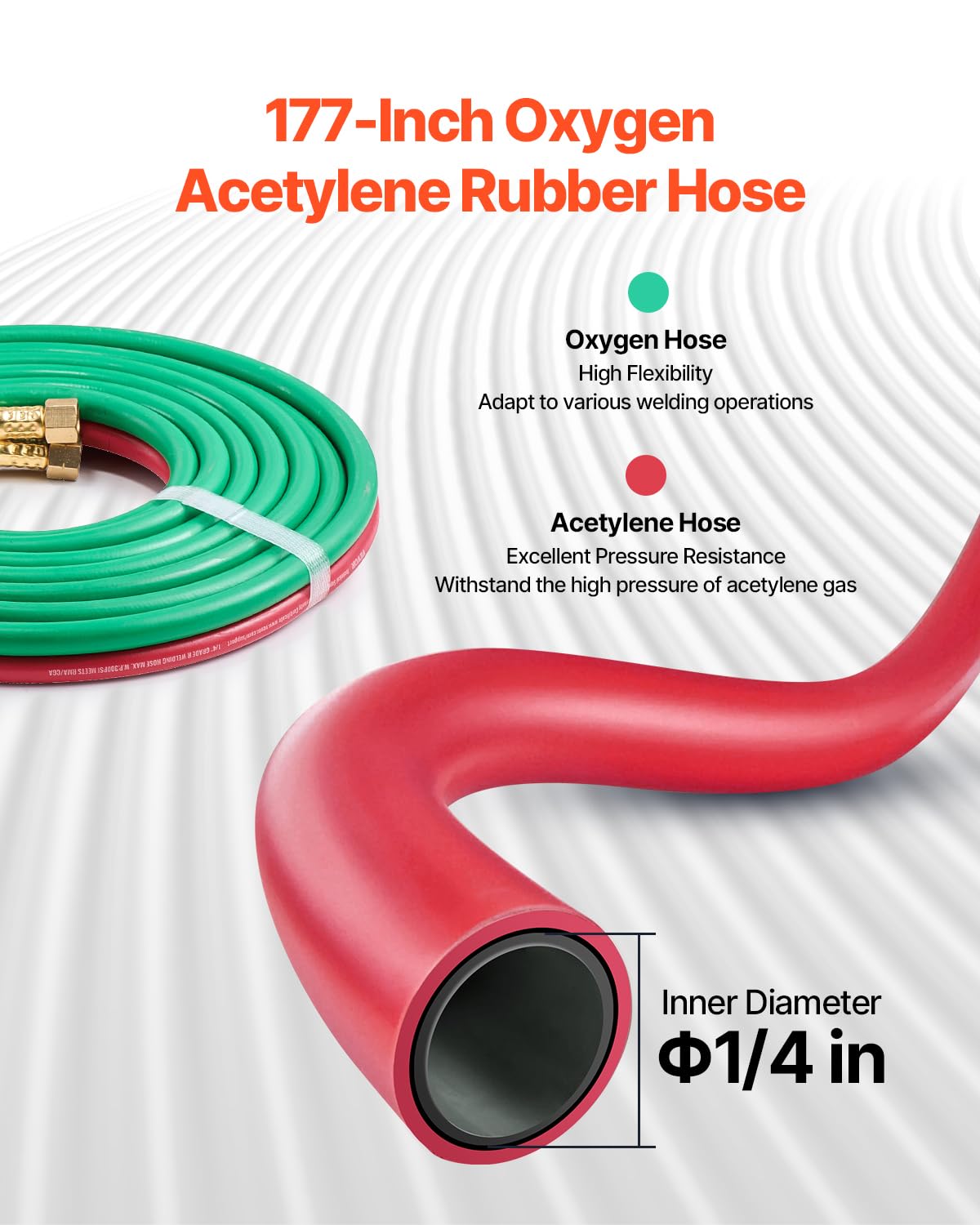 Durable 177-Inch Hose: The oxy-acetylene welding kit comes with 2 hoses (177-inch) crafted from high-quality rubber and flame-resistant materials. Built for durability, it resists wear and aging, ensuring steady gas flow and reliable performance for the long haul.