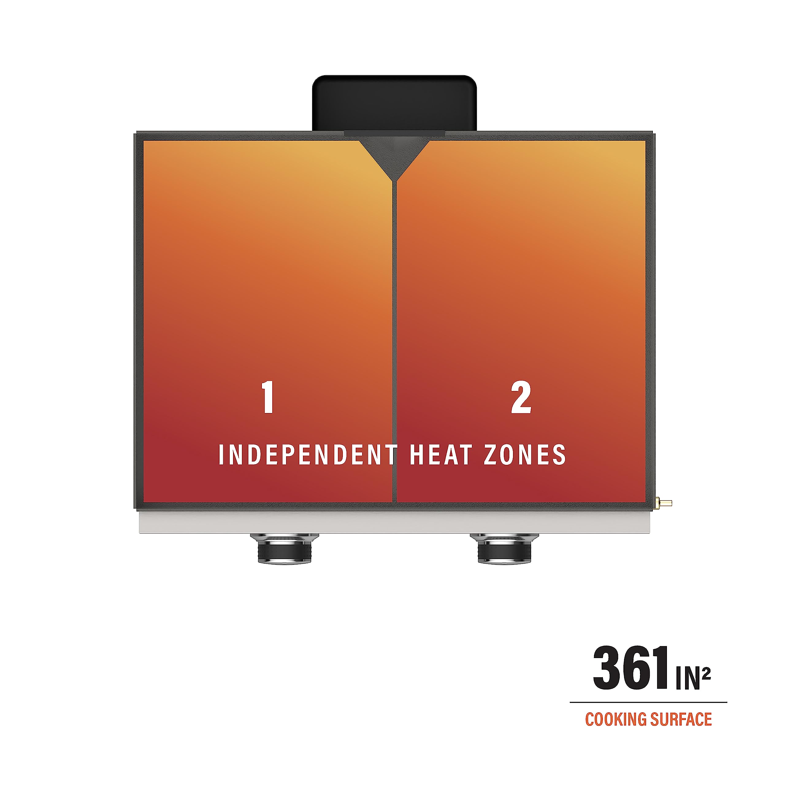 Features: Two adjustable heat controls with built-in igniters, Integrated grease management system