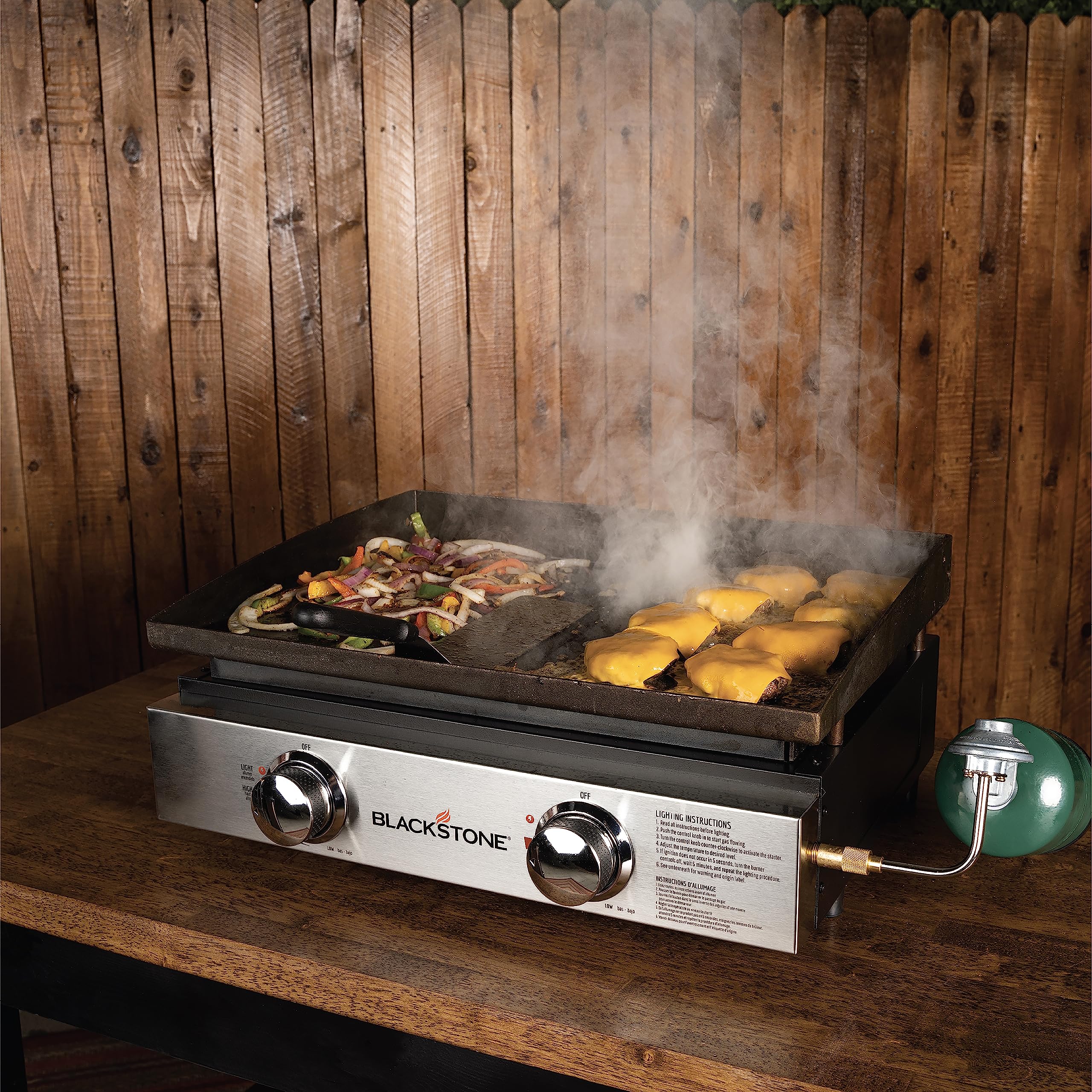 Take the Blackstone 22'' Gas Tabletop 2 Burner Griddle anywhere outdoors for big and versatile meals. Equipped with two independently controlled heat zones. You’ll have full control of the 352 sq. inch plate for simultaneous low and high heat cooking. The two "H" style burners provide even heat distribution for optimal cooking across the whole griddle. Stable on any surface from grassy hills to muddy terrain, so you can eat up delicious burgers, hot dogs, steaks, eggs, and more! No stress - easy to clean and feeds the whole family. The product has an integrated Grease Management System.