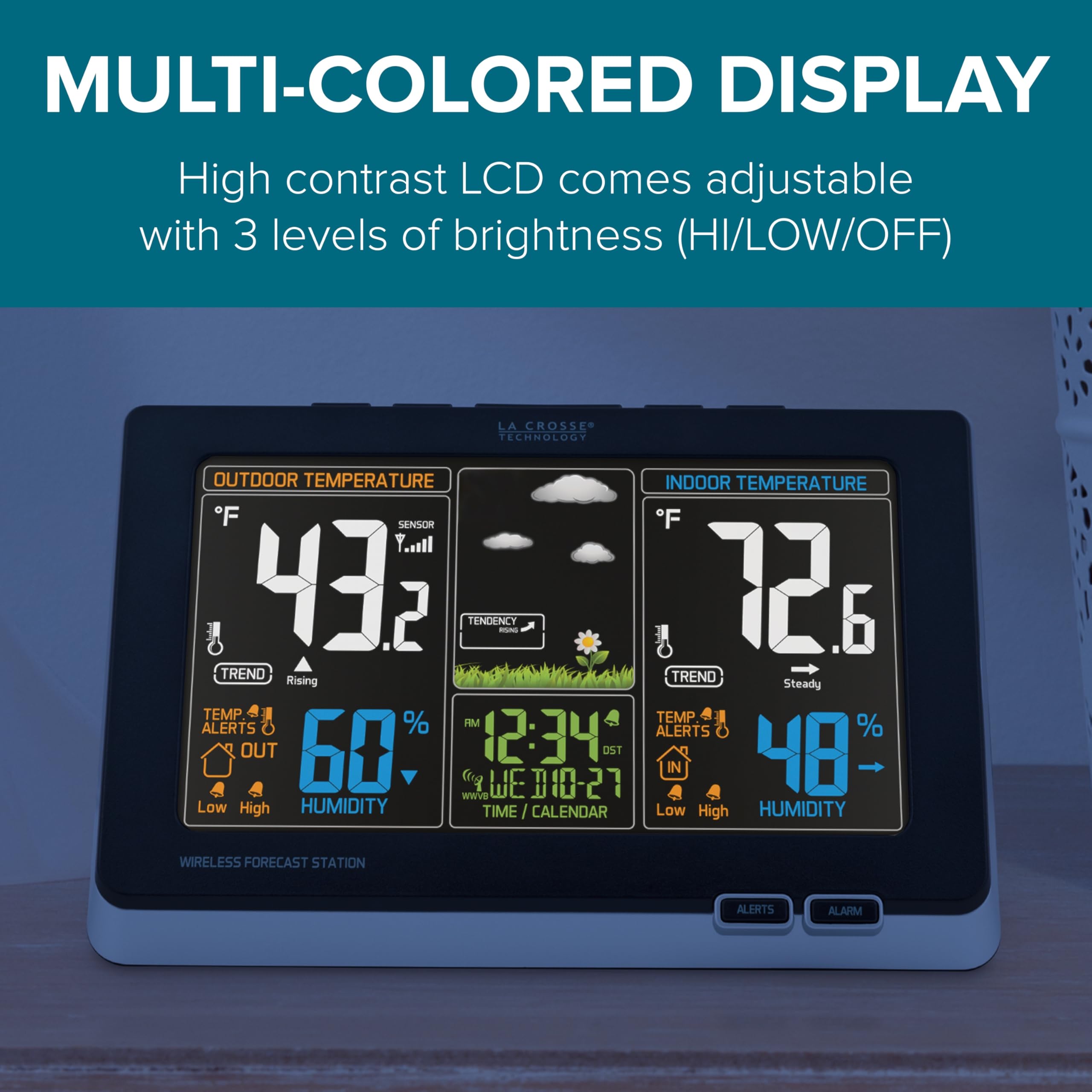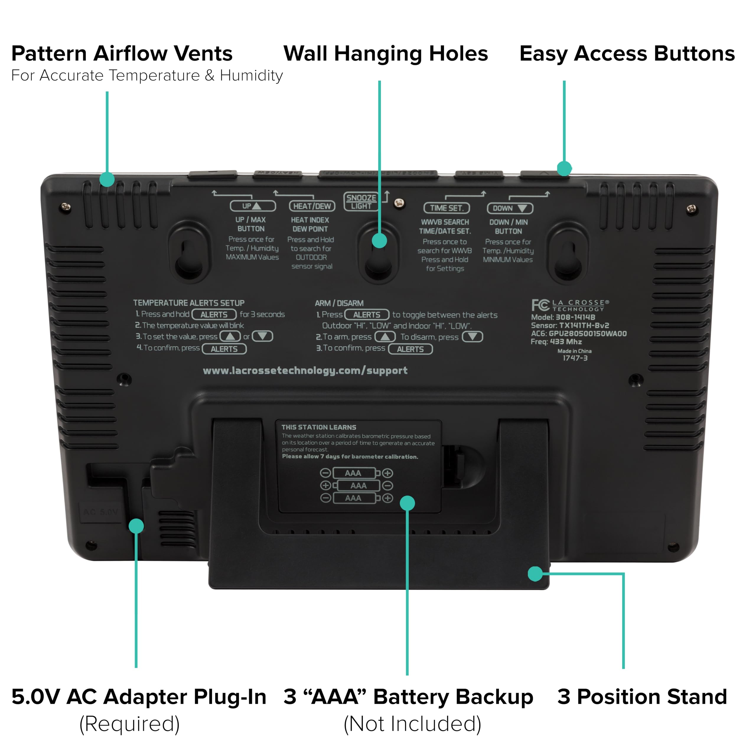 Full color display gives you current temperatures & humidity, with a future forecast whether it could be sunny or rainy to snowy. Features accurate, self-set atomic time & date with automatic DST updates. Records min/max values and alerts you of extreme temperatures. Also displays your heat index and dew point. Will indicate of low battery and reception strength. Batteries required (not included.).Weather Station Factory Restart Explanation: The factory restart returns the weather station and outdoor sensor to an ?out-of-the-box? default state and often resolves an issue. Factory Restart: 1. Remove all power (batteries and AC) from outdoor sensor and weather station. 2. Press one of the buttons on the weather station at least 20 times to clear all memory. 3. Verify that the weather station is blank before proceeding (there may be lines painted on the screen that will show when there is no power). 4. Leave both units without power for 15 minutes (very important). 5. Insert the AC power cord into the wall outlet then into the weather station. 6. Insert fresh batteries into the outdoor sensor. 7. Press the TX button on the outdoor sensor to transmit RF signal. 8. Keep the outdoor sensor 5-10 feet from the weather station. 9. When RF connection is established, the temperature will appear on the station. Allow the outdoor sensor and weather station to sit together for 15 minutes to establish a strong connection. 10. Do not press buttons for 15 minutes. For optimum 433MHz transmission, place the outdoor sensor no more than 300 feet (91 meters, open air) from the weather station Explanation: The factory restart returns the weather station and remote sensor to an “out-of-the-box” default state and often resolves an issue. Factory Restart: 1. Remove all power (batteries and AC) from remote sensor and weather station. 2. Press one of the buttons on the weather station at least 20 times to clear all memory. 3. Verify that the weather station is blank before proceeding (there may be lines painted on the screen that will show when there is no power). 4. Leave both units without power for 15 minutes (very important). 5. Insert the AC power cord into the wall outlet then into the weather station. 6. Insert fresh batteries into the remote sensor. 7. Press the TX button on the remote sensor to transmit RF signal. 8. Keep the remote sensor 5-10 feet from the weather station. 9. When RF connection is established, the temperature will appear on the station. Allow the remote sensor and weather station to sit together for 15 minutes to establish a strong connection. 10. Do not press buttons for 15 minutes. • For optimum 433MHz transmission, place the remote sensor no more than 330 feet (100 meters, open air) from the weather station. Note: In Mounting/Positioning Remote sensor First: Place the remote sensor in the desired shaded location and the weather station in the home. Wait approximately 1 hour before permanently mounting the remote sensor to ensure that there is proper reception. POSITION Outdoor: • Protect the remote sensor from standing rain or snow and from the overhead sun, which can cause it to read incorrectly. • Mounting under an eave or deck rail works well. • If you choose, you can construct a small roof or box for the remote sensor. Be sure a box has vents. • Mount the remote sensor on the North side where to prevent sun from causing incorrect readings. • Mount at least 6 feet in the air for a strong RF (radio frequency) signal. • Do not mount the remote sensor on a metal fence. This significantly reduces the effective range. • Remote sensors are water resistant, not waterproof