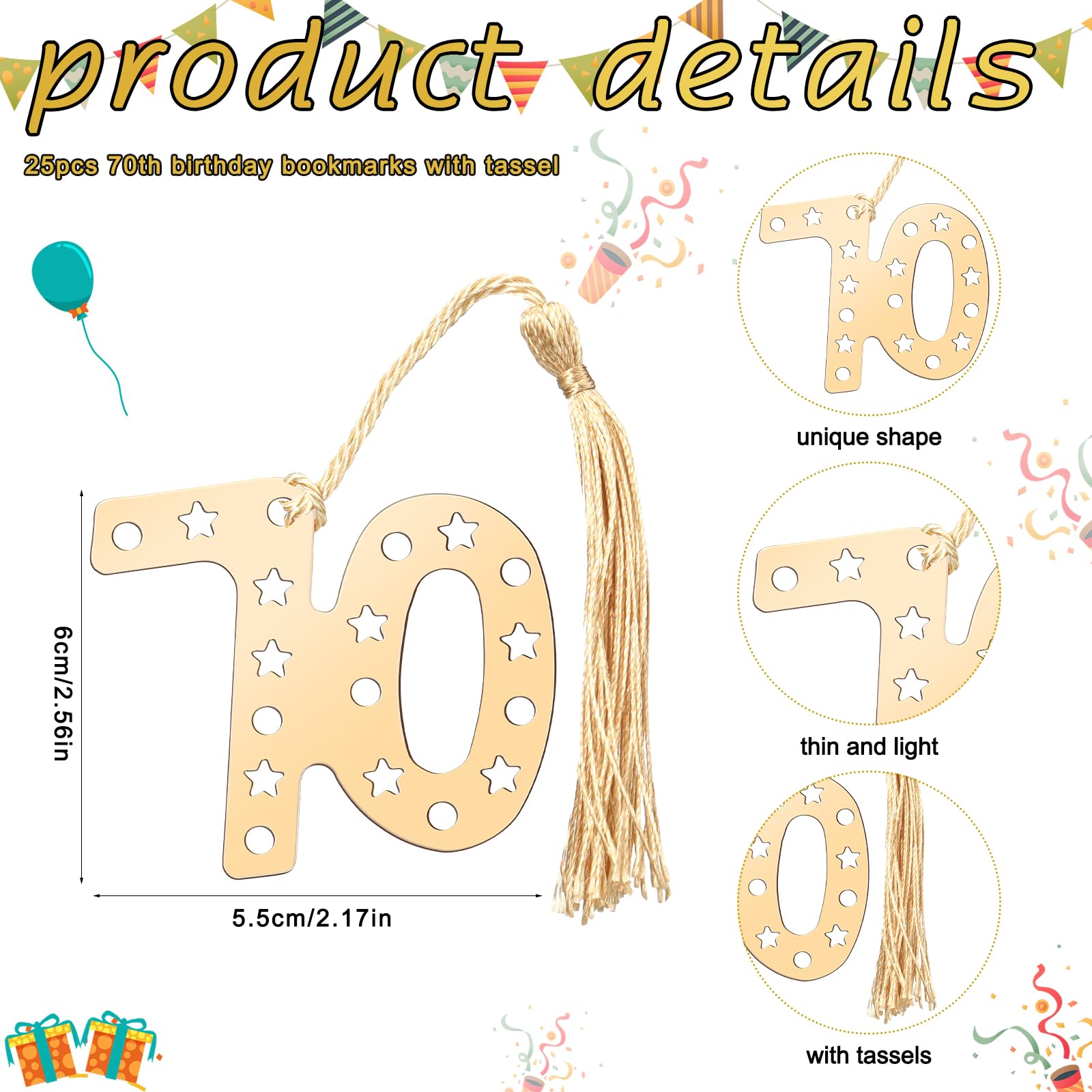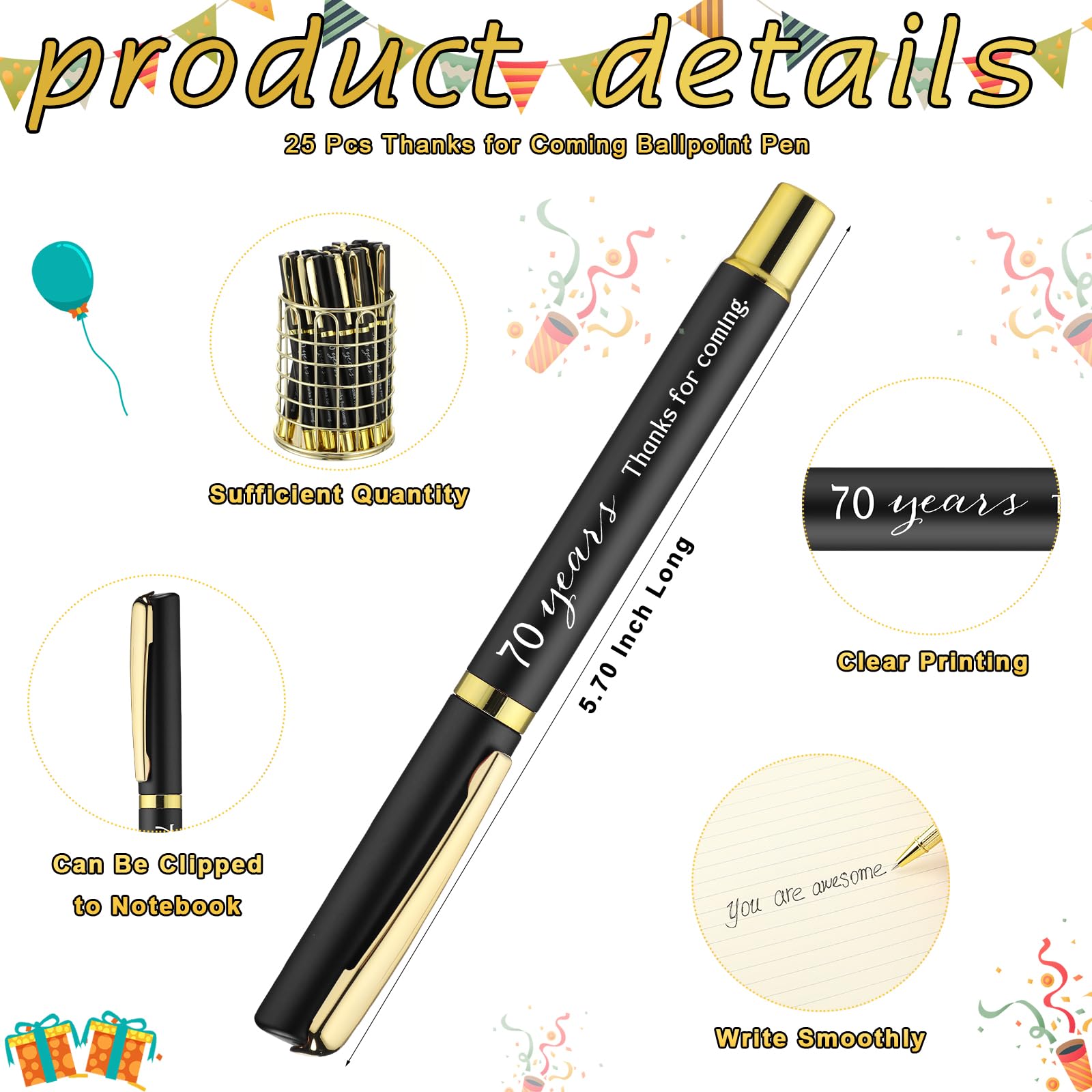Features: Elegant color scheme: Designed in a refined color palette of gold and black, the 70th birthday souvenirs for guests offer a distinctive aesthetic appeal. The elegant color scheme enhances the visual appeal and makes the favors more classy and memorable. Ideal guest gifts: Each component of this 70th birthday party favors for guests is thoughtfully chosen and designed to serve as ideal gifts for guests. The stunning detail and practicality of each item make them a charming souvenir of a memorable occasion, truly capturing the joyful atmosphere of the celebration. Specifications: Material: main alloy Color: black, gold Size: Birthday bookmarks: about 3.74 x 2.56 inches/ 9.5 x 6.5 cm Birthday ballpoint pen: about 5.7 inches/ 14.5 cm long Birthday tags: about 2.76 x 1.77 inches/ 7 x 4.5 cm Package includes: 25 x Birthday bookmarks 25 x Birthday ballpoint pens 25 x Birthday tags 25 x Organza bags A bundle of rope Notes: Manual measurement, please allow slight errors on size. The color may exist a slight difference due to different screen displays.