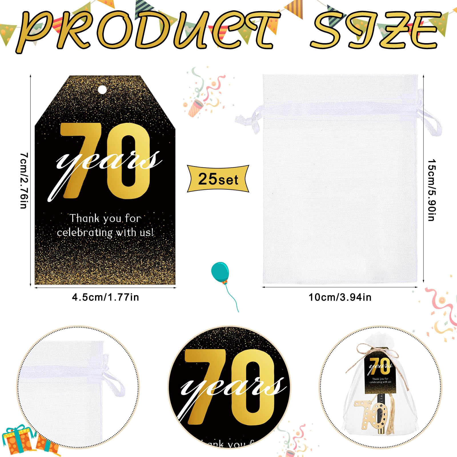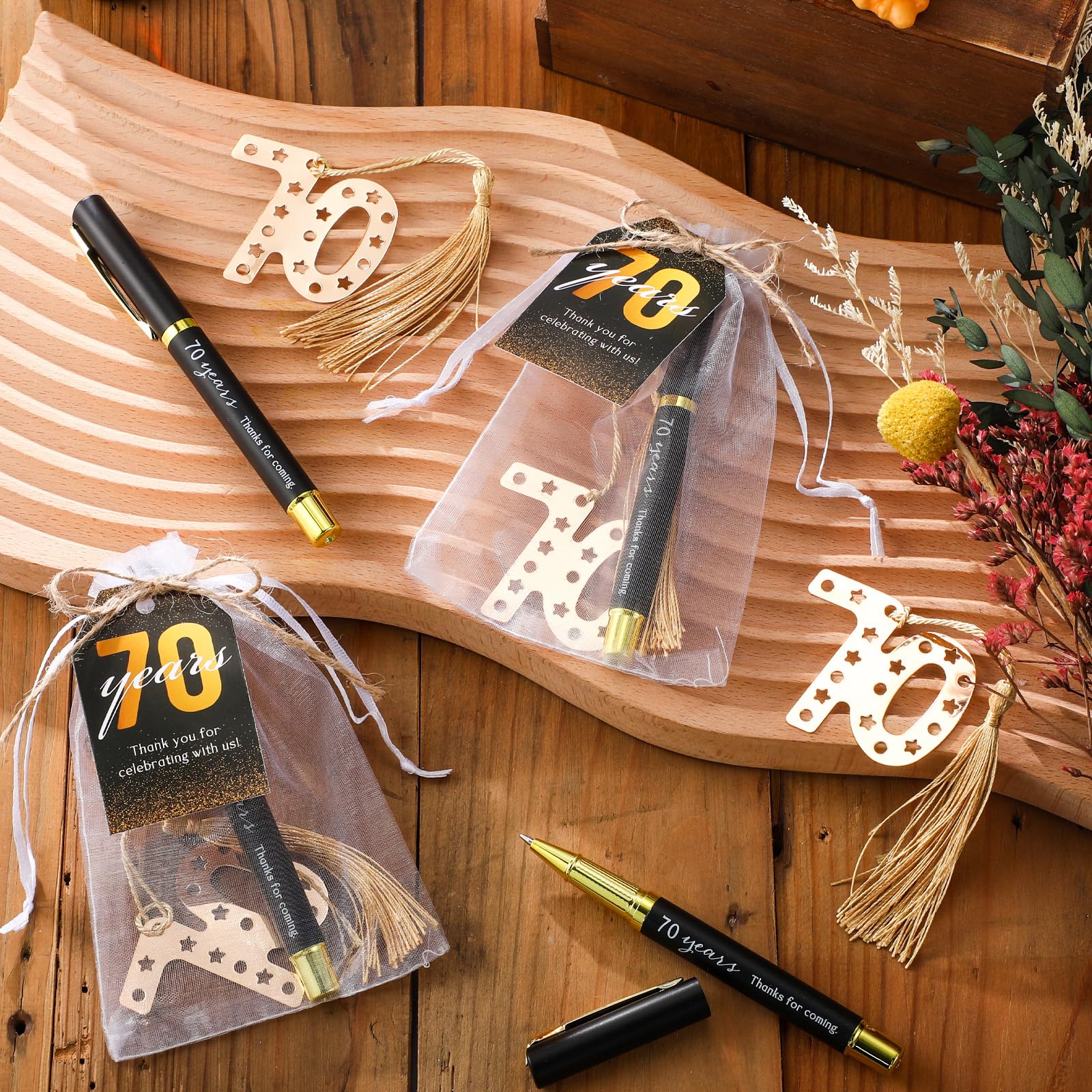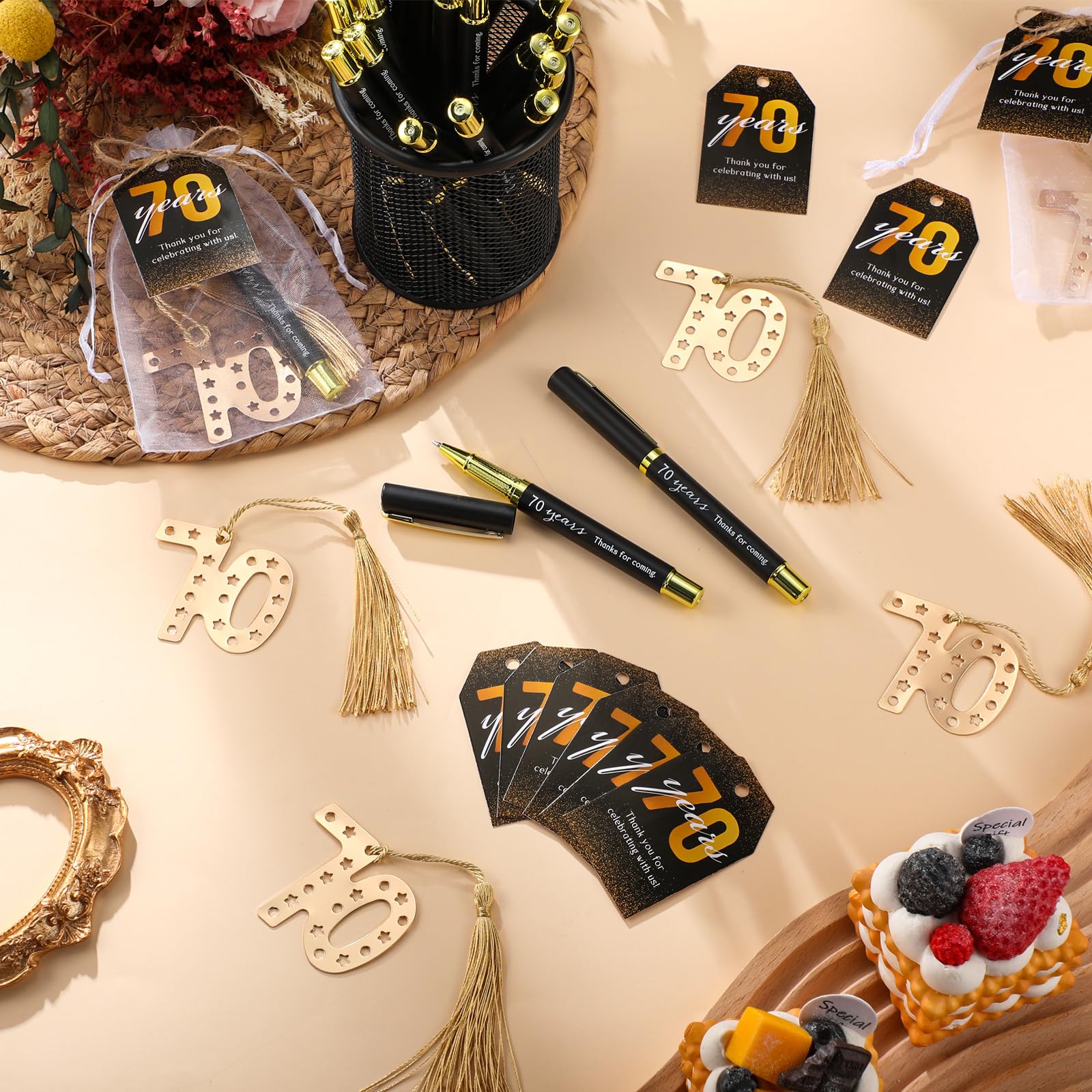 Comprehensive Package Set: this distinctive 70th birthday package provides guests with an all inclusive set that includes 25 pcs 70th birthday bookmarks, 25 pcs birthday pens, 25 pcs thank you tags, and 25 pcs organza bags; Additionally, a bundle of rope is provided for convenience; This comprehensive package provides a complete gifting solution for the host