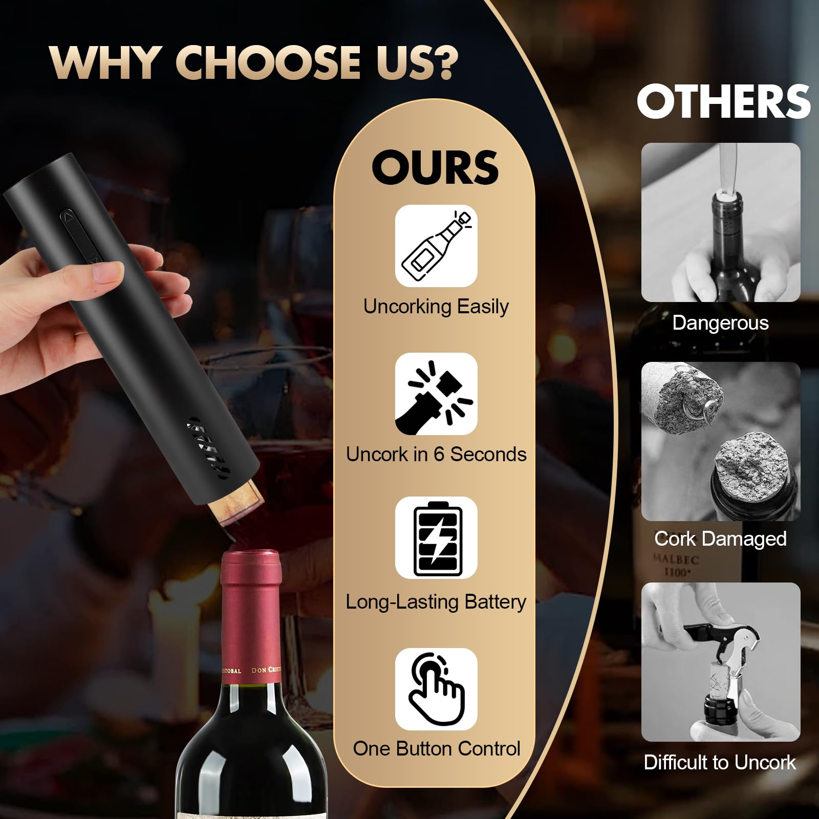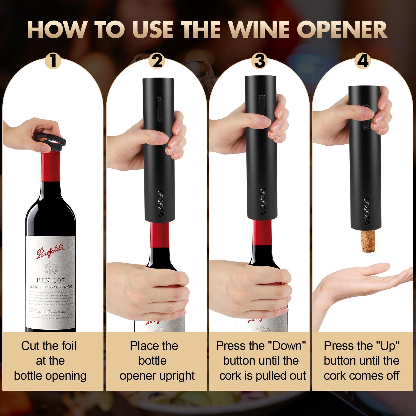 Easy to Use: Simply follow three steps to open your wine in seconds: 1. Place the foil cutter on the bottle neck and rotate to cleanly cut the foil. 2. Position the electric wine opener vertically over the bottle and press the button below to remove the cork effortlessly. 3. Once the cork is fully removed, press the release button on top and the cork will automatically drop out within seconds. A truly effortless wine opener electric experience that makes it the perfect wine bottle opener for any occasion