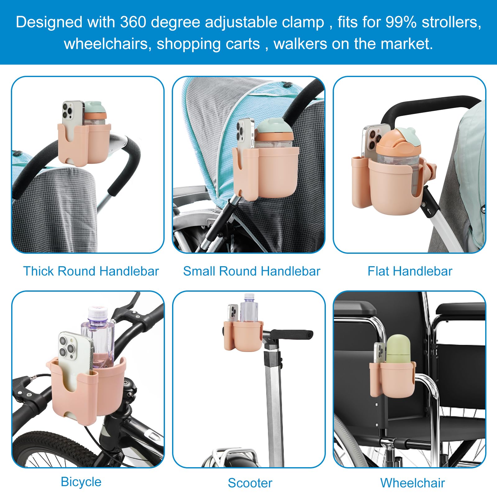 This wheelchair cup holder with phone holder fits for most walkers, wheelchair, scooter, rollator, bicycle, boat handle bar, shopping cart, kayak, ATV, lawnmowers, motorcycle, treadmill etc.