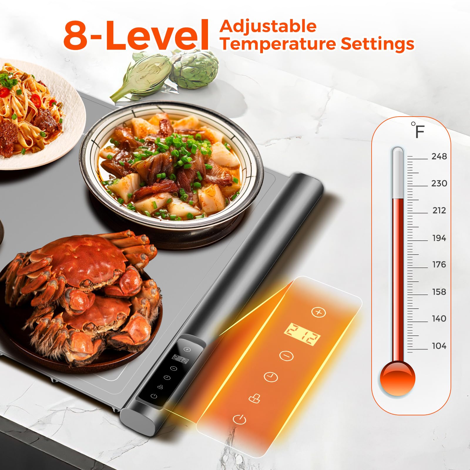 Adjustable 8-Level Temperature Control: Enjoy the convenience of precise temperature adjustment for both warming and heating. temperature options:104,140,158,176,194,212,230,248℉,Our 8-level temperature control feature ensures your food is kept at a perfect temperature, enhancing your dining experience