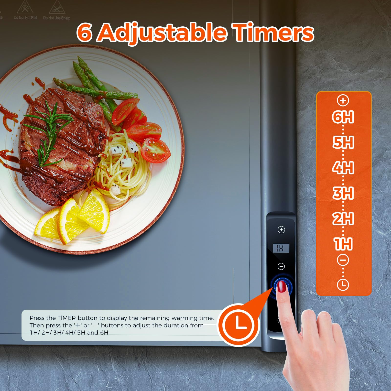 6 Hours timer and Safe Use:The food warmer has a 1-6 Hours timer,You can adjust the usage time according to the dining situation.If you forget to close the warming mat for food, don't worry,our product will be automatically closed after opening 2 hours, to ensure the safety of you and your family