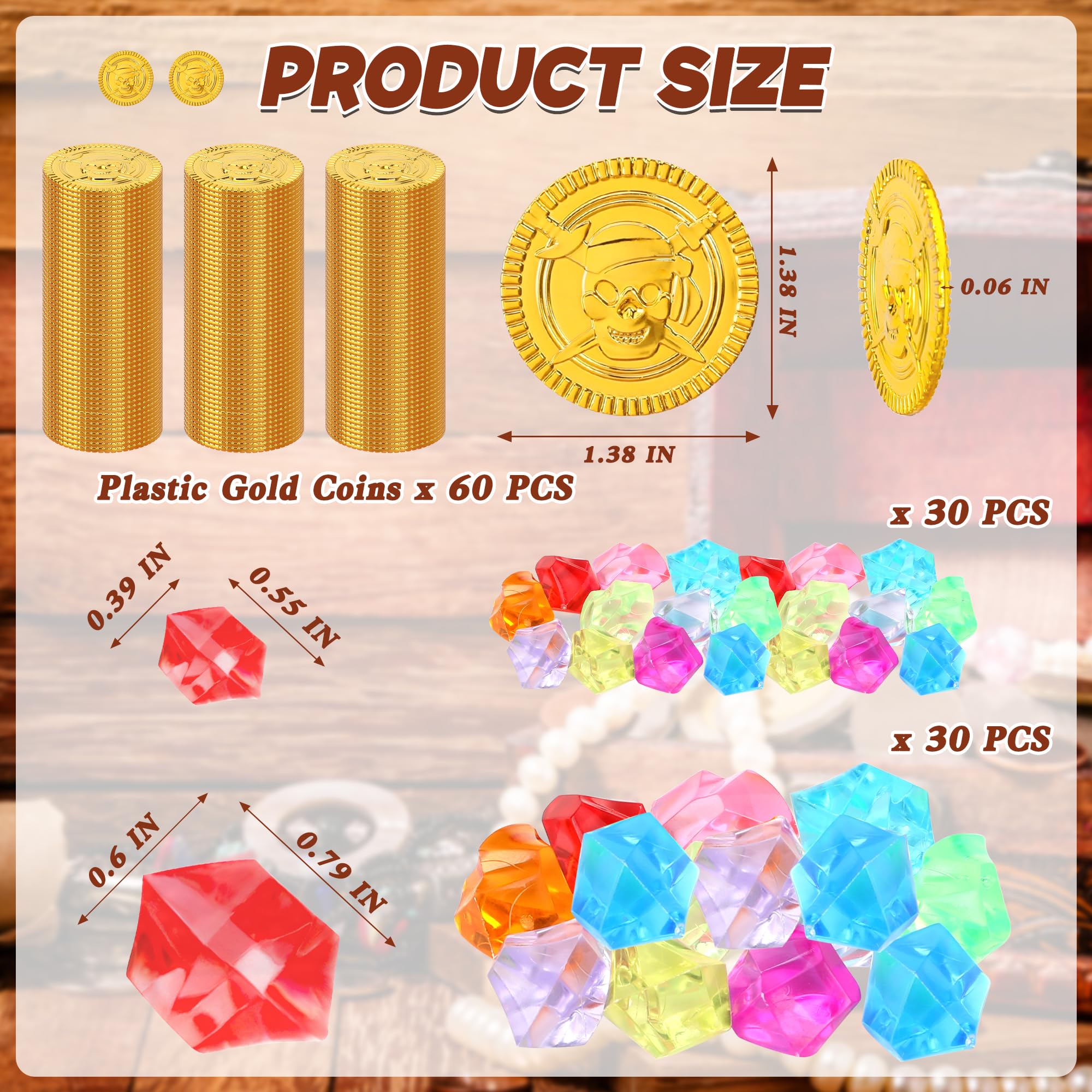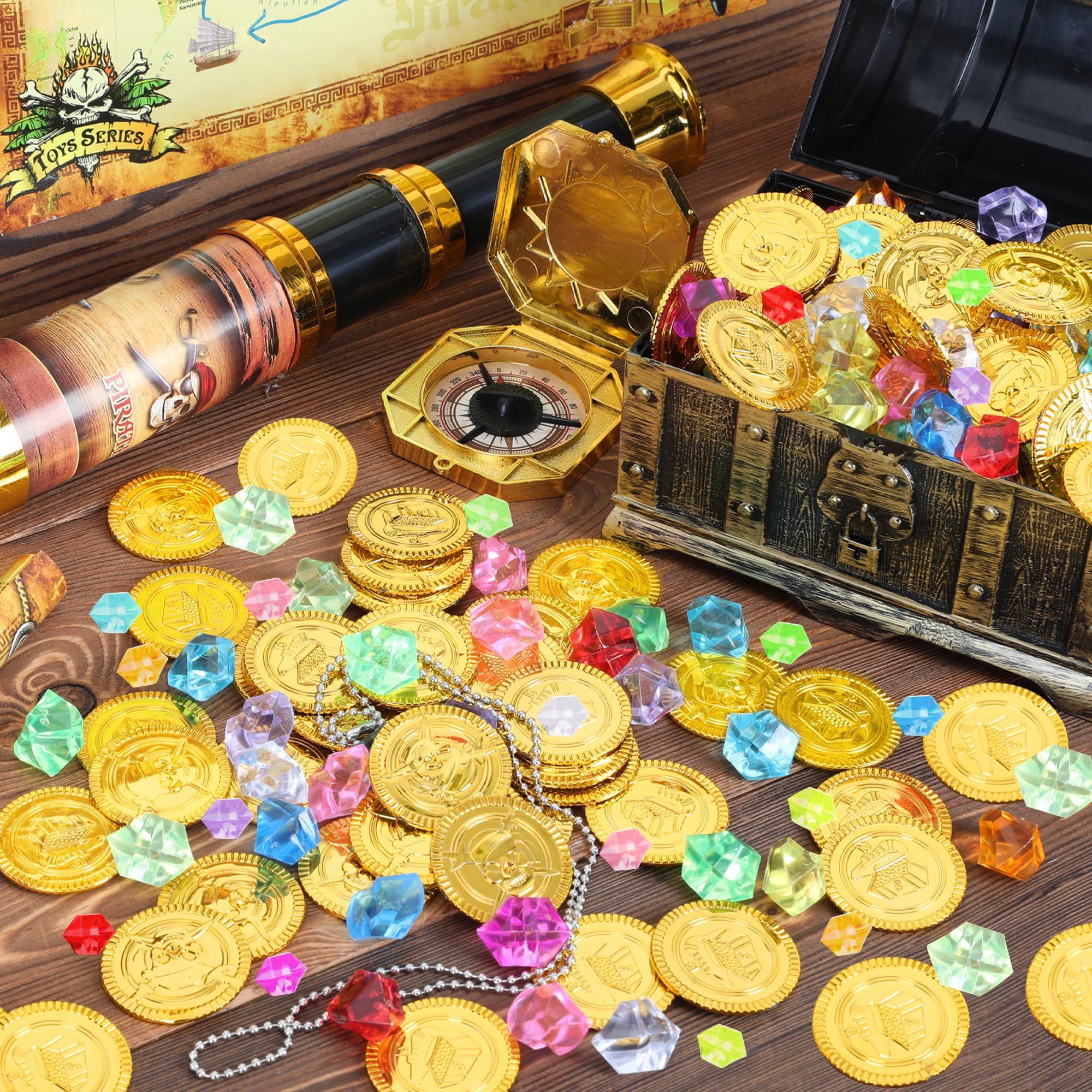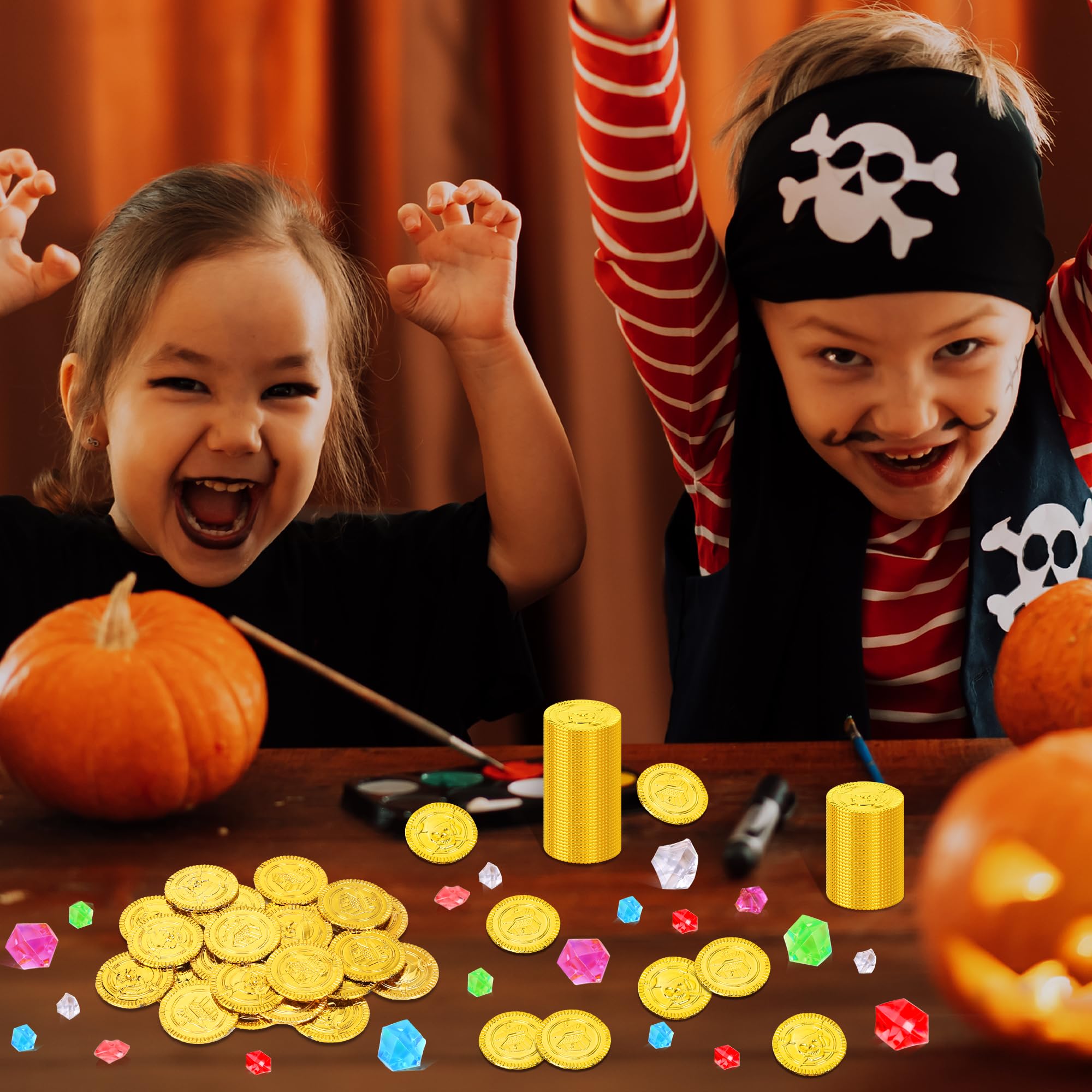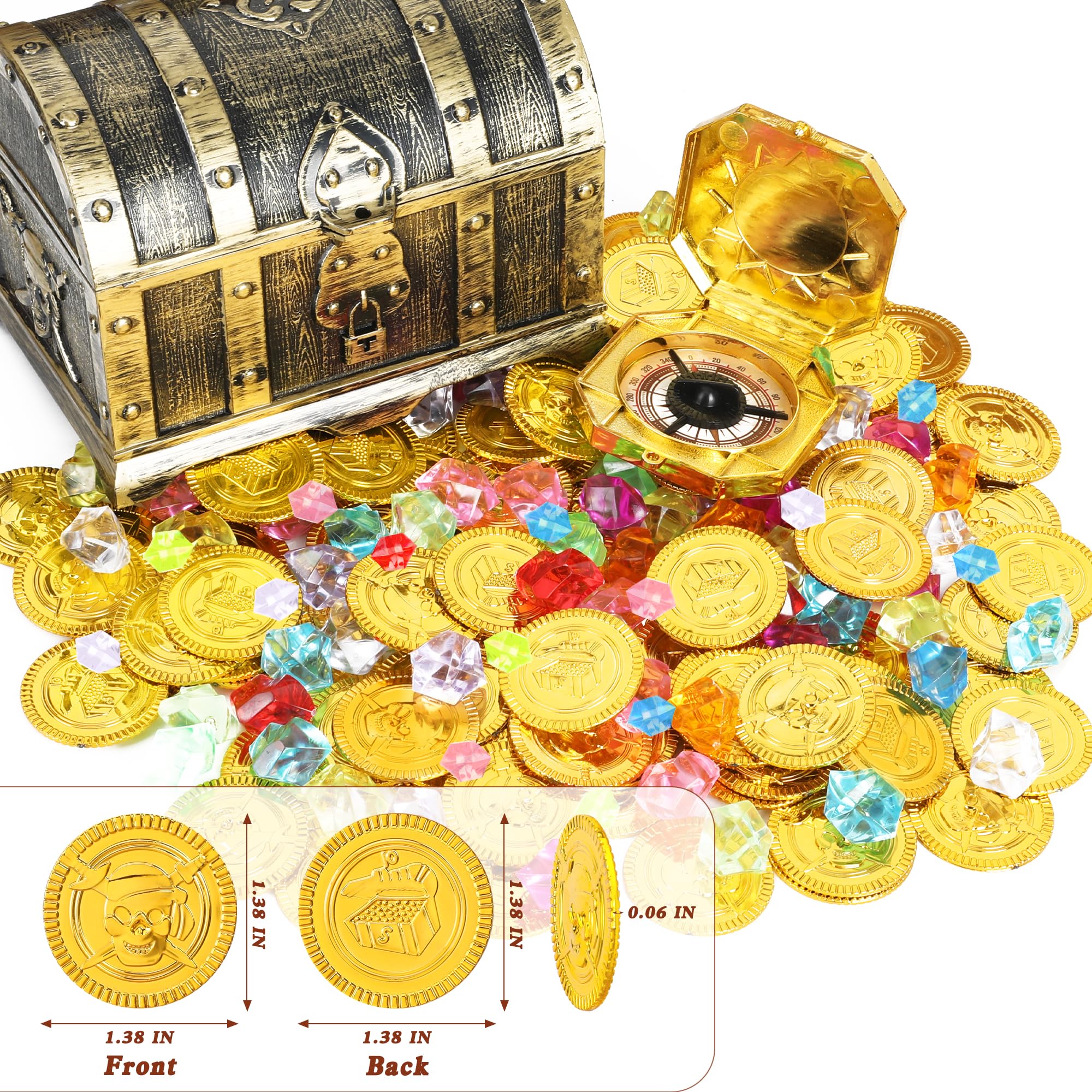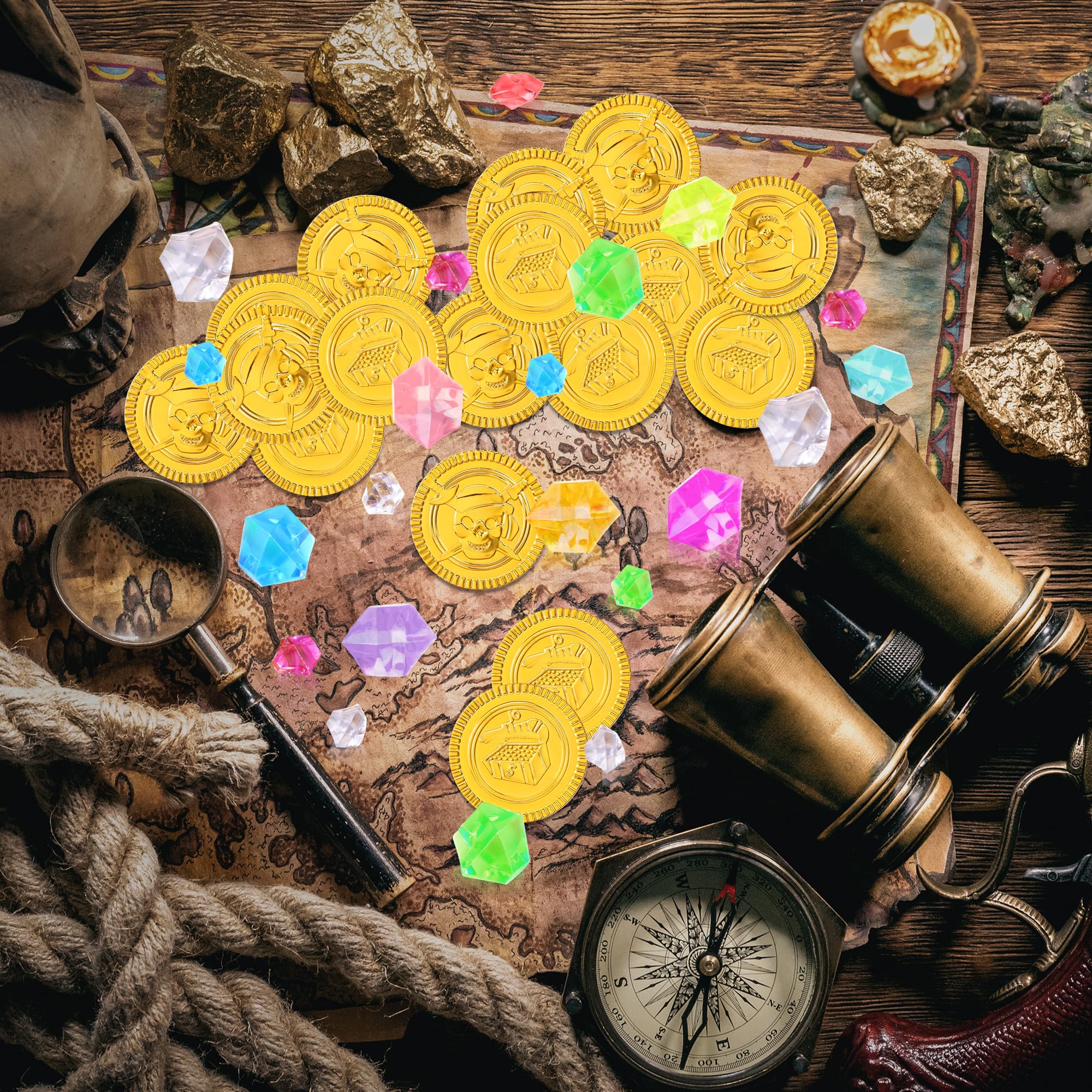 Quantity: There are 120 pieces in this set, including 100 pcs fake gold coins and 100 pcs colorful pirate gems, plenty of pieces for pirate party decorations.