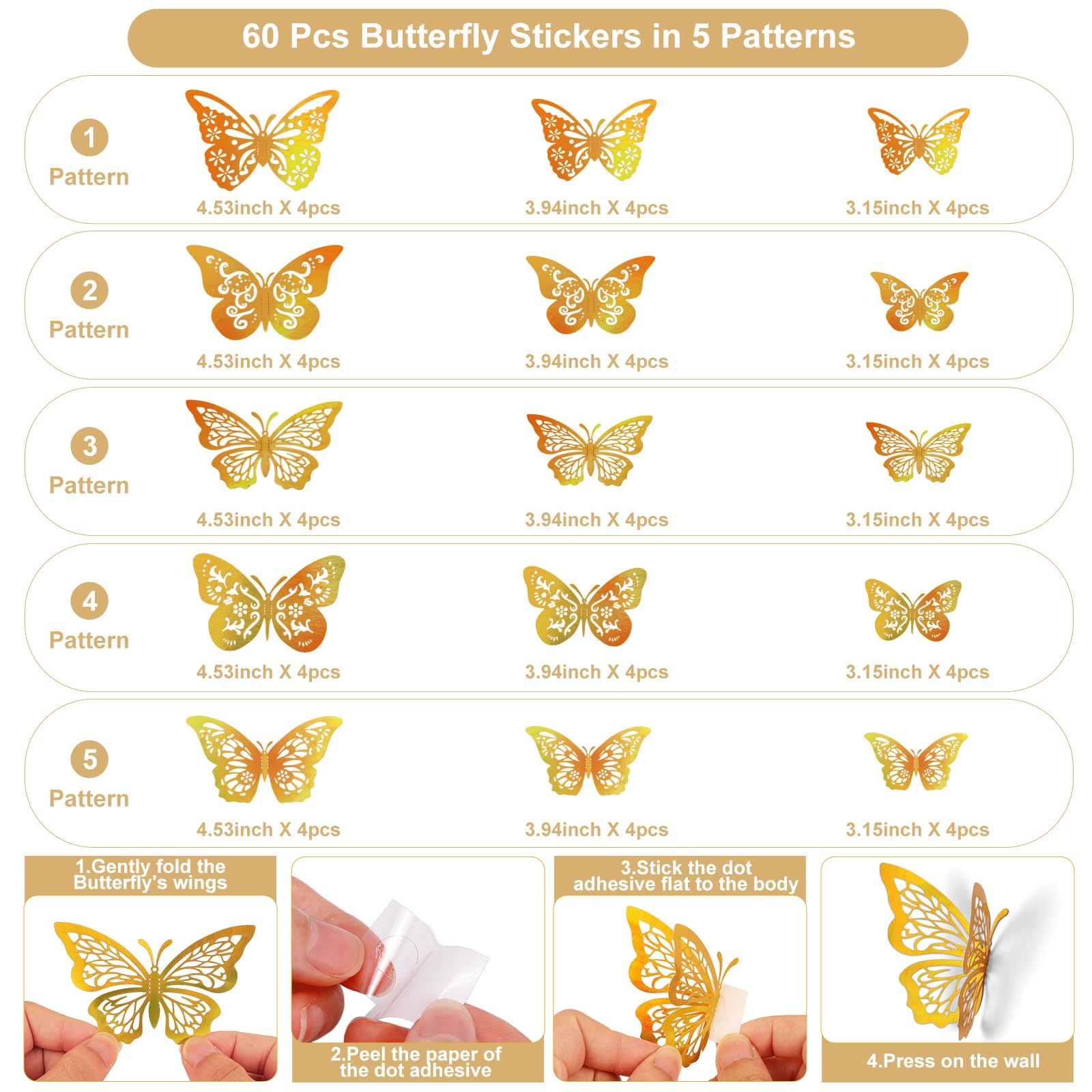 What You Will Receive - You will get 60 pcs butterflies wall stickers, each coming with double-sided glue dots. 12 pcs pattern 1, 12 pcs pattern 2, 12 pcs pattern 3, 12 pcs pattern 4 and 12 pcs pattern 5, each pattern has 3 sizes (3.15", 3.94", 4.53").