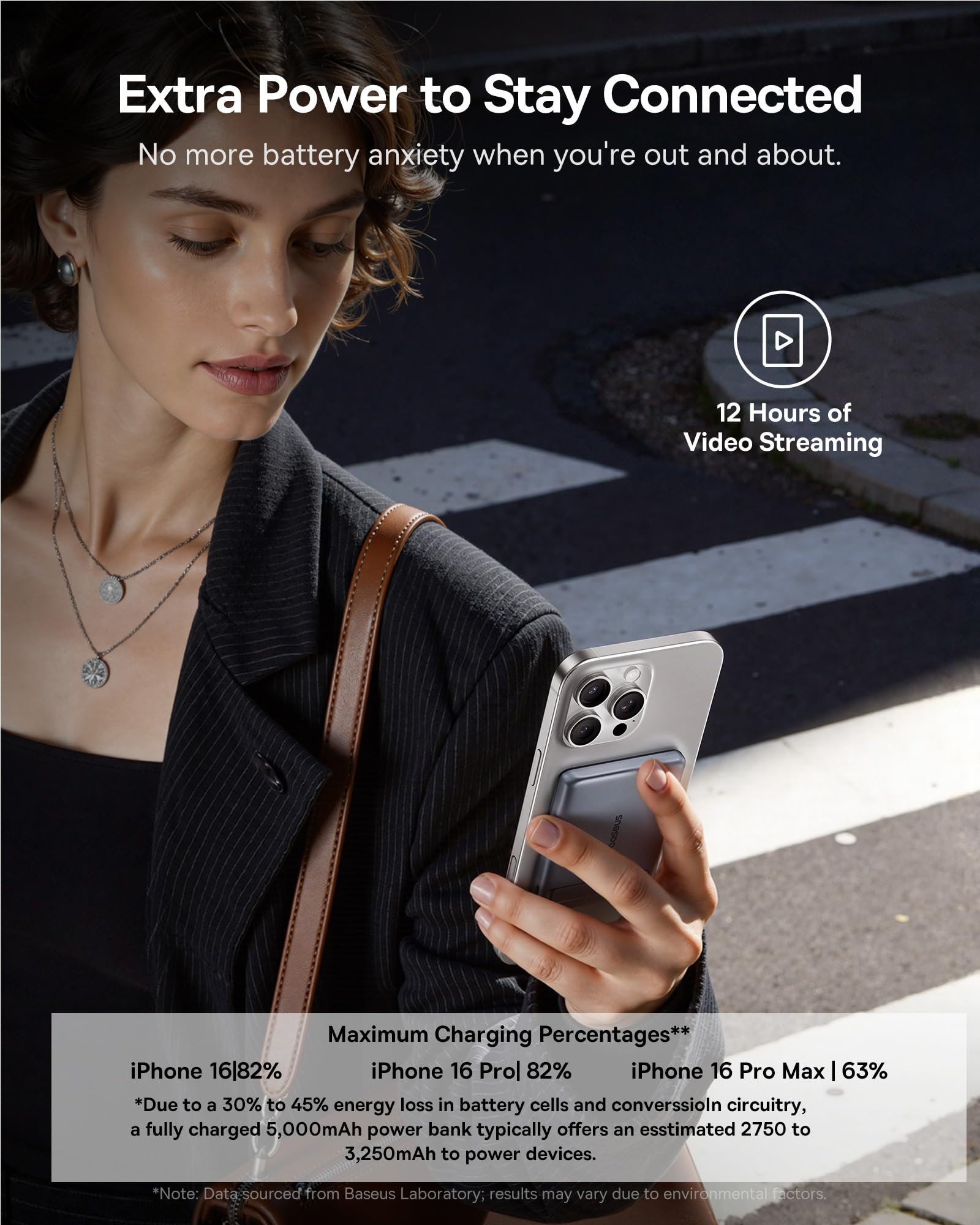 âĄď¸ăSuper Fast ChargingăEquipped with a 15W Max QI2 wireless charging and a 20W Max USB-C port, whether you are using it as an iPhone wireless charger or charging via USB-C, you can effortlessly charge your devices at home or on the go. The reliable 5000mAh capacity provides extra power when you need it most, eliminating the anxiety of low battery.