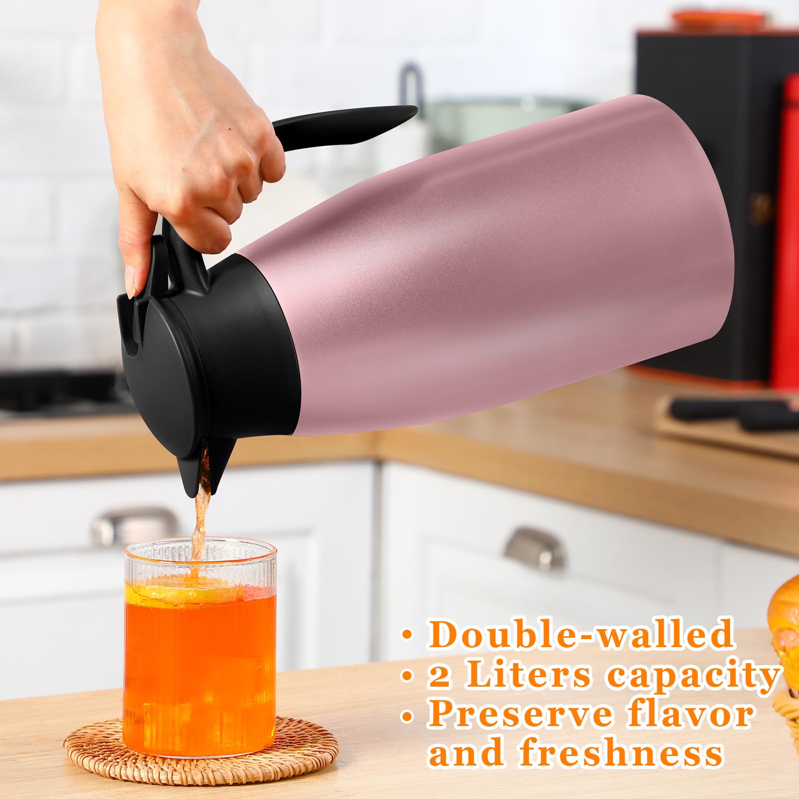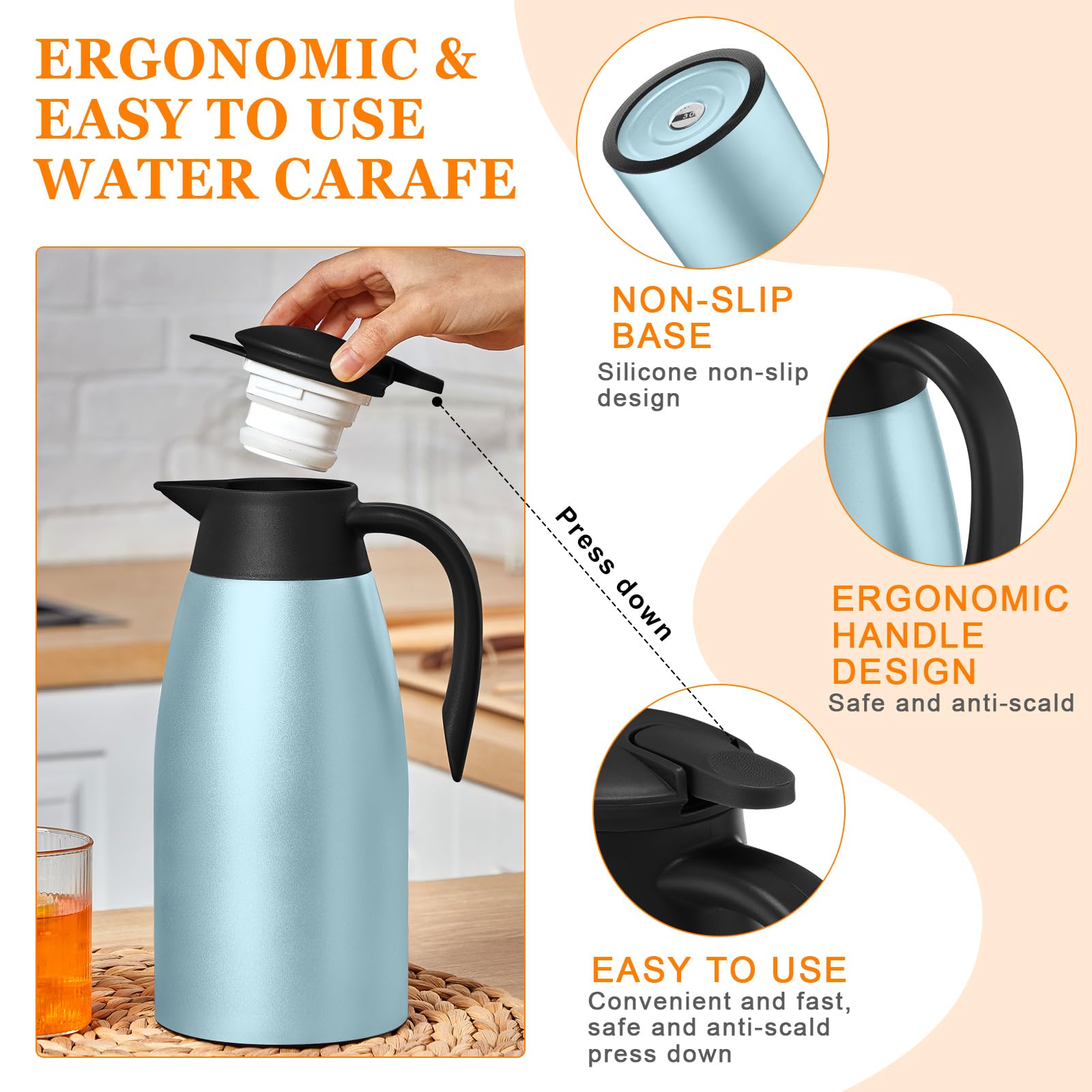 Proper Capacity: the vacuum insulated thermal coffee carafe measures about 68 oz in capacity, ideal size for holding tea, coffee, milk, water, juices, and other cold or hot drinks; With a nonslip silicone base, it can keep stable on your table or countertop