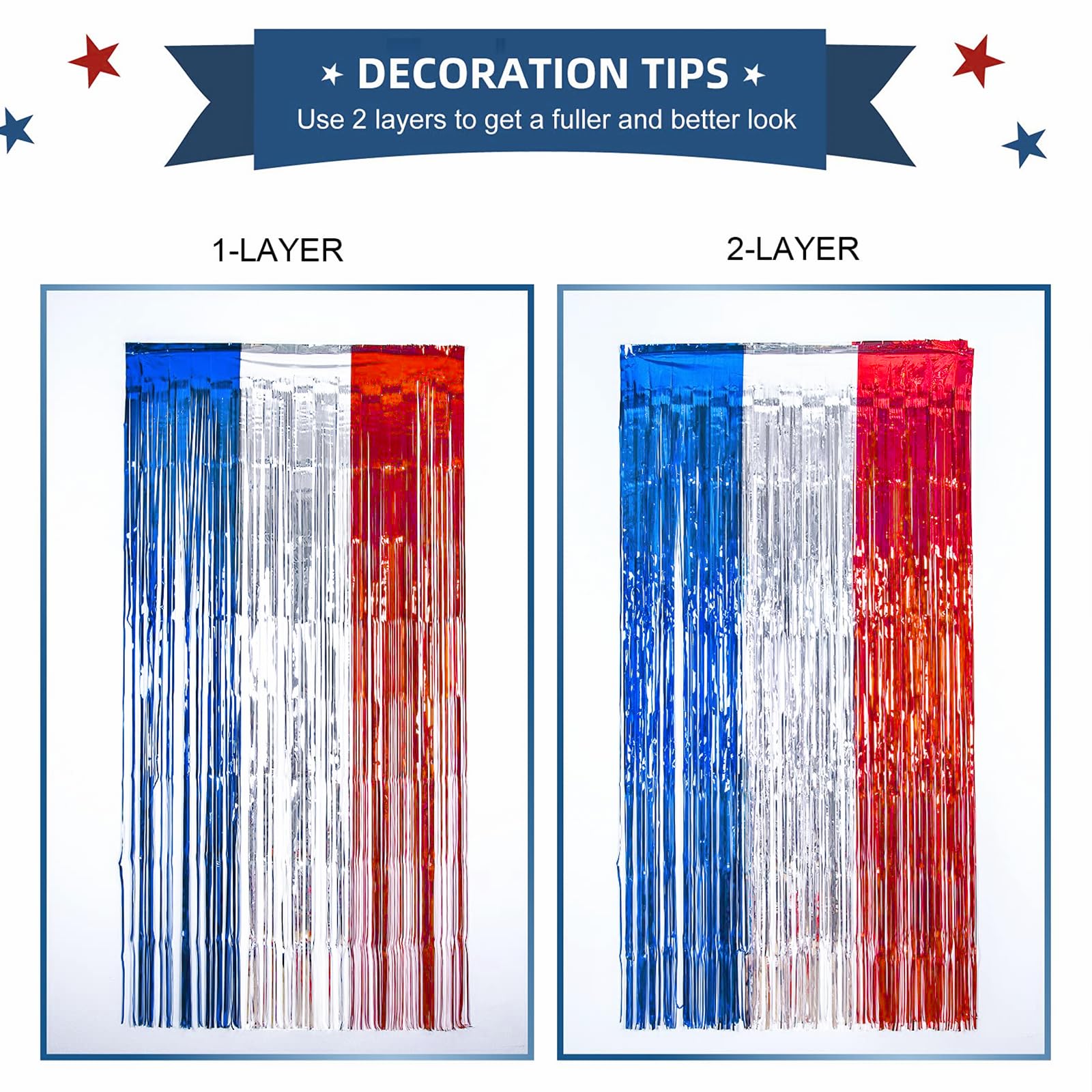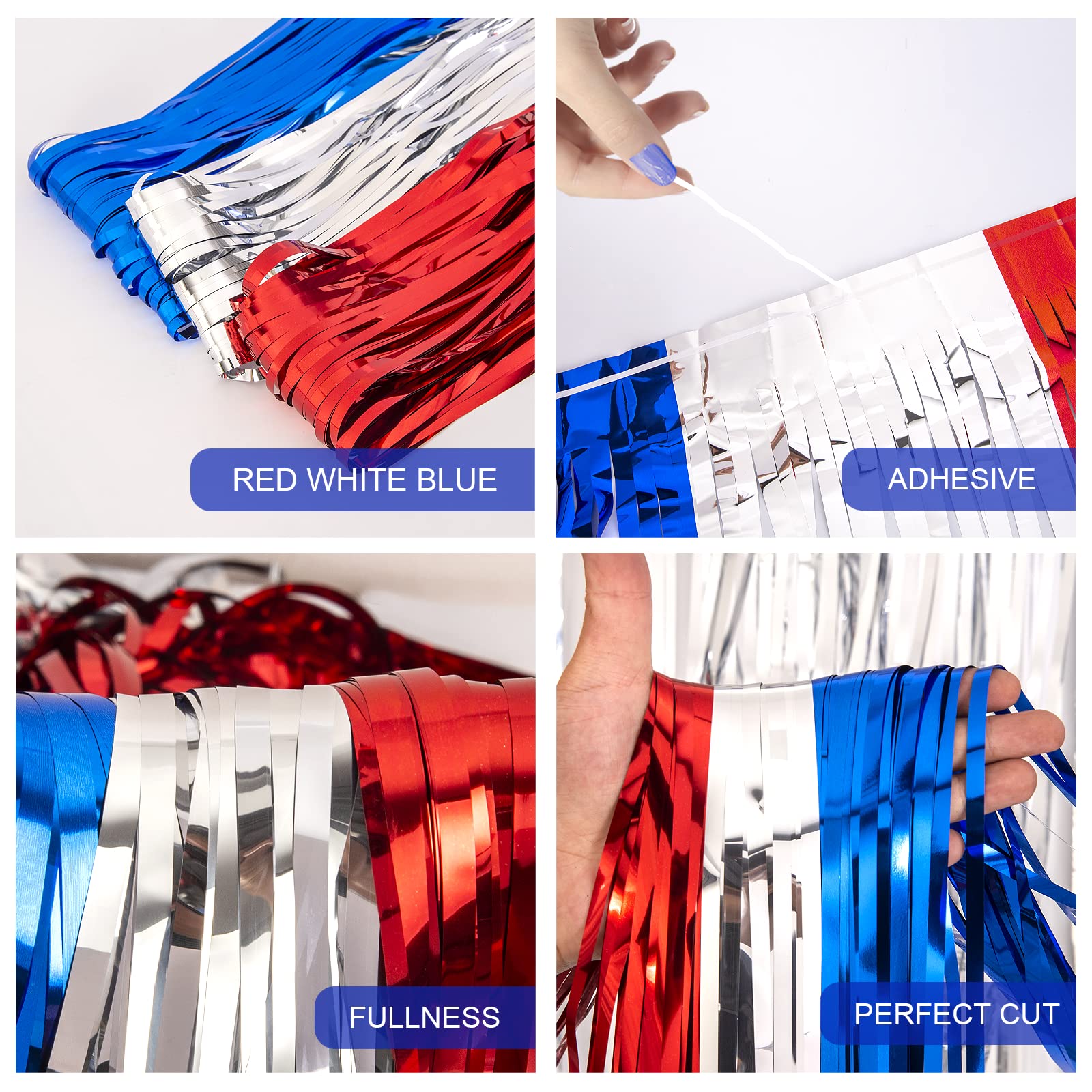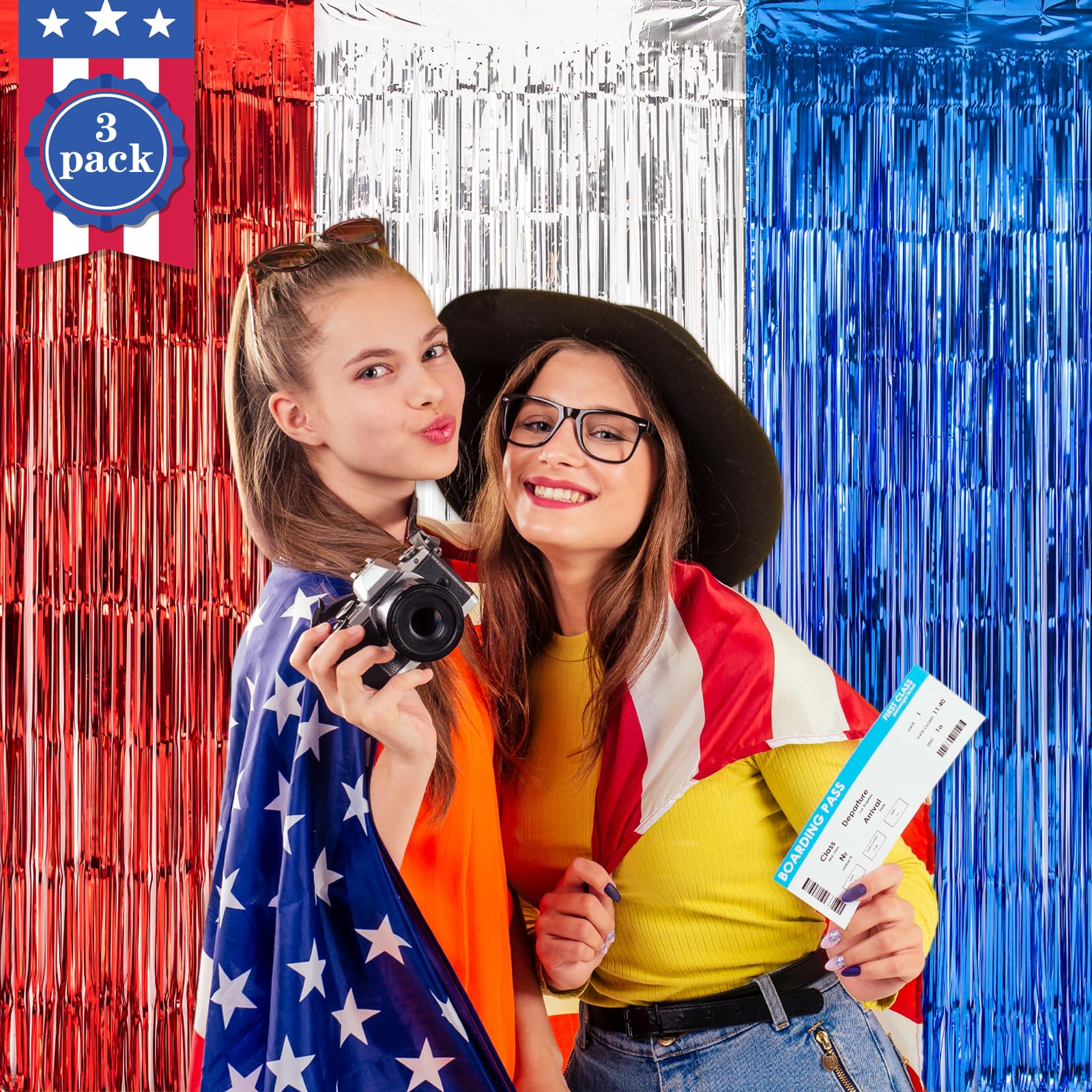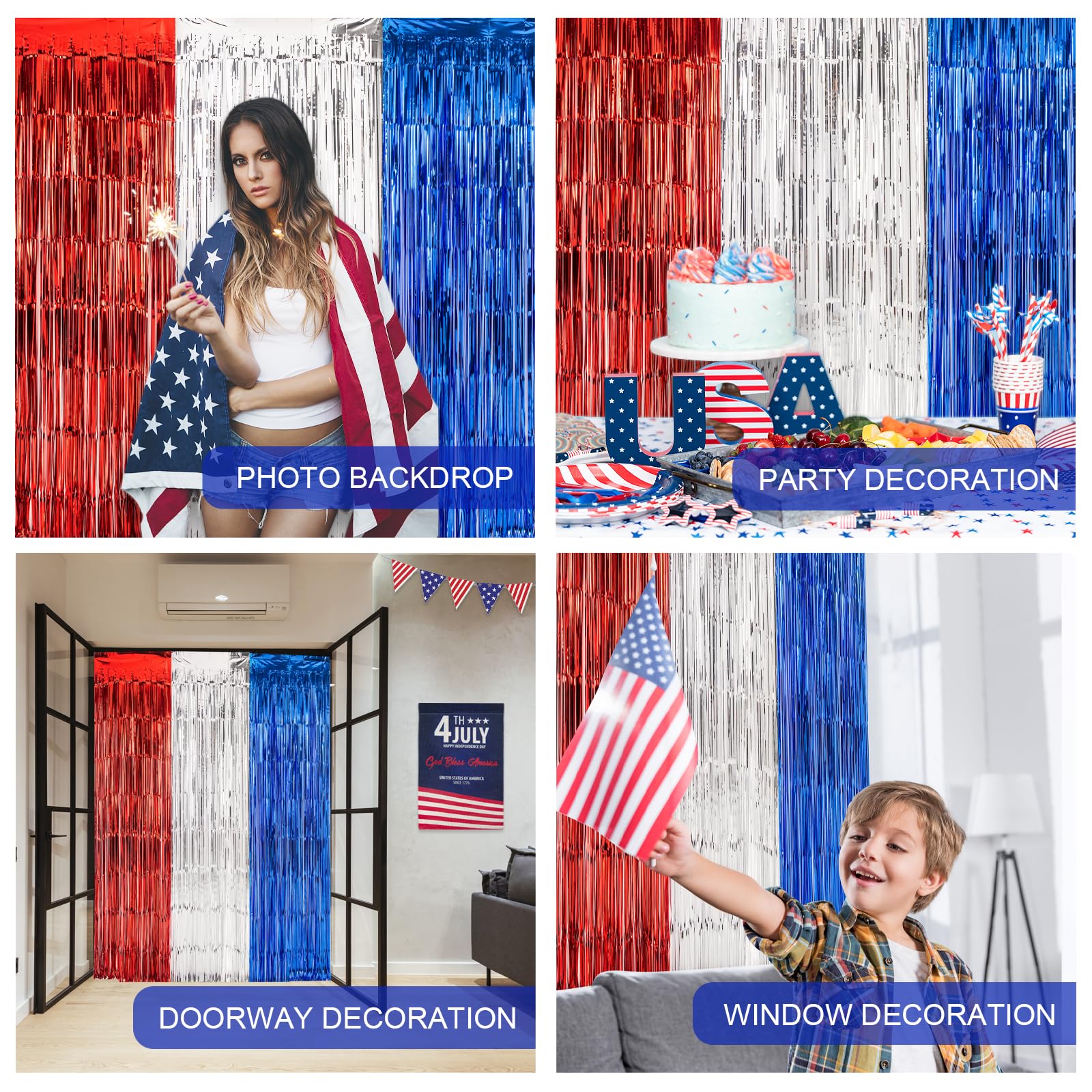 🔴⚪️🔵 PACKAGE INCLUDES: 3 pack foil fringe curtains. Red white and blue per pack. Size (width x drop) is: 3.3 x 6.6 ft each, wonderful patriotic party decorations photo booth props.