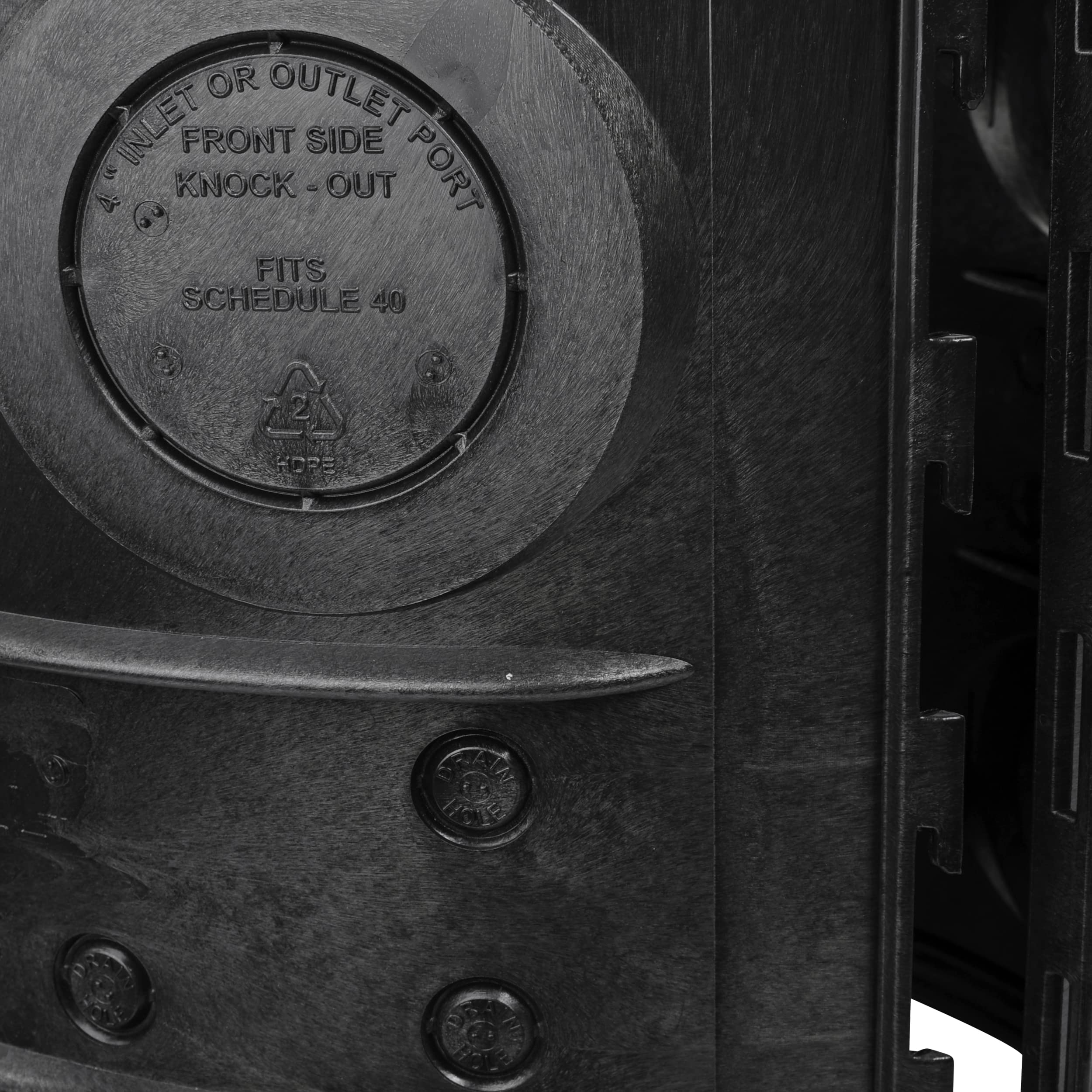 HOW TO INSTALL: Connect to 4" Sewer and Drain (S&D) Pipe through top cover knockout; 12 side-panel knockout points connect 4" S&D and Sch 40 Pipes; Can be buried or stacked up to 8 ft deep and supports pedestrian traffic, including lawn tractors