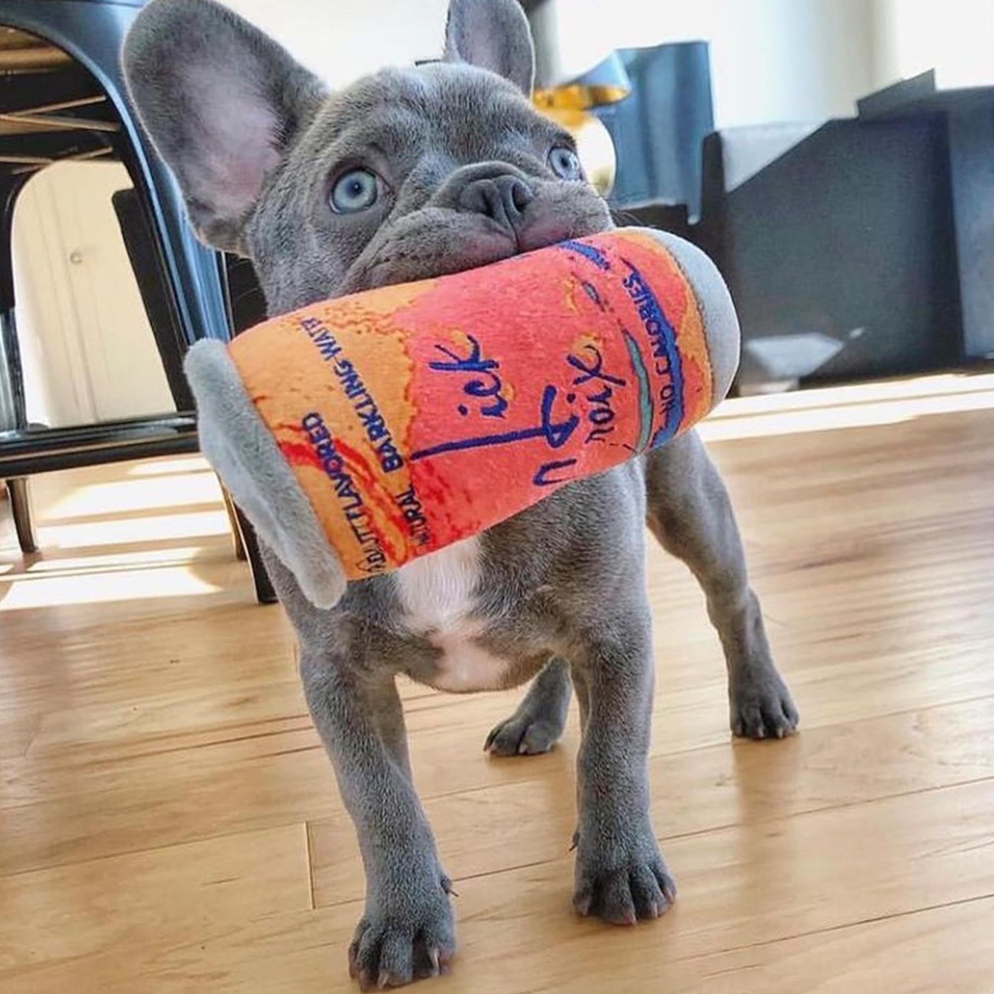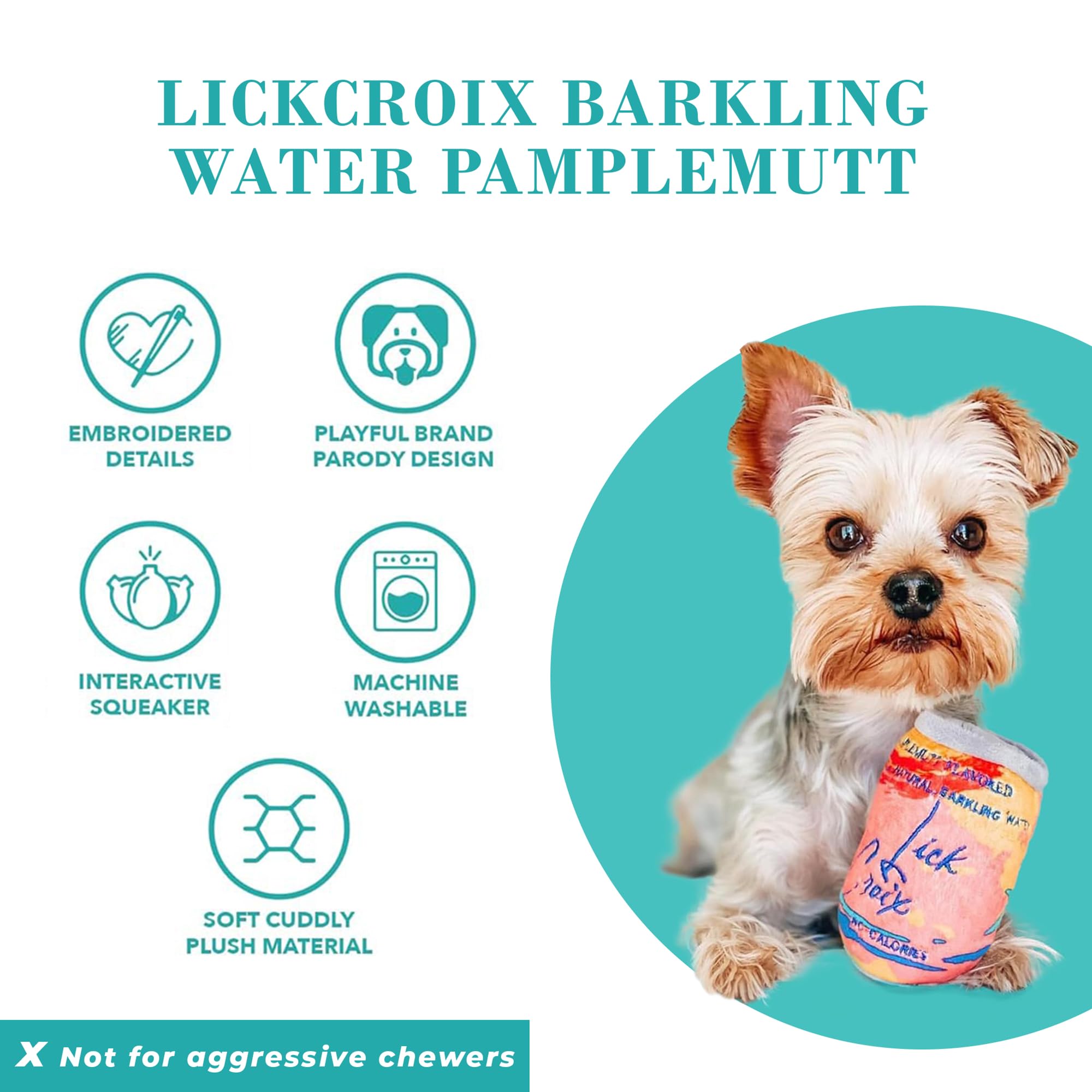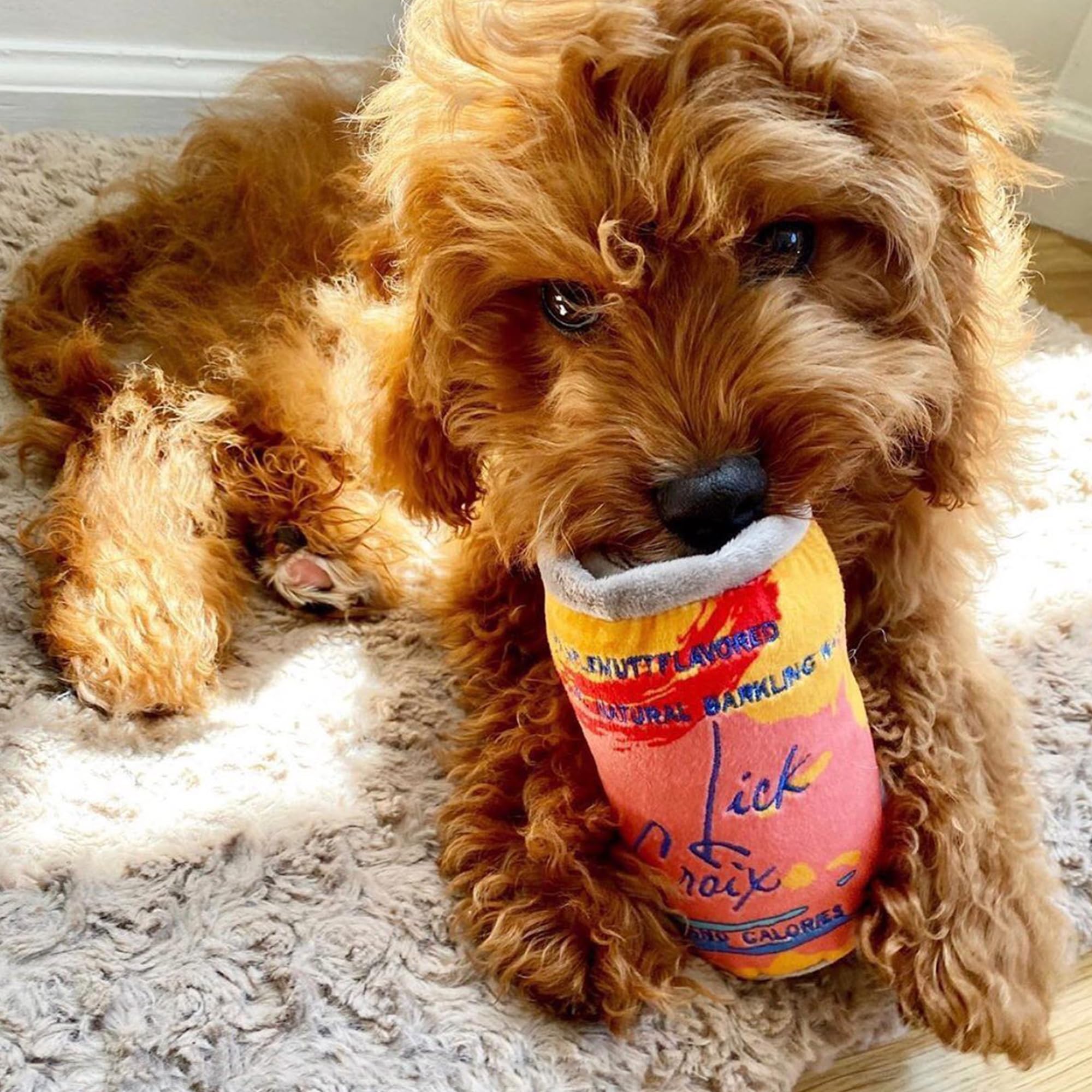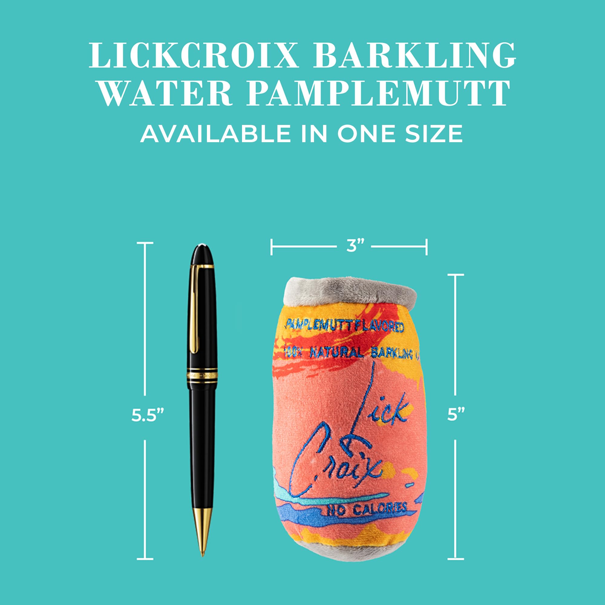 Funny Parody Plush Dog Toy: Let your pup bubble up with excitement and keep them hydrated with our LickCroix Barkling Water Pamplemutt dog toy. This dog toy features an orange colored plush exterior with a built-in squeaker hidden inside. It’s a fun, cute interactive dog to quench your furry friend's thirst during playtime! One Size 5”x4.5"x3".