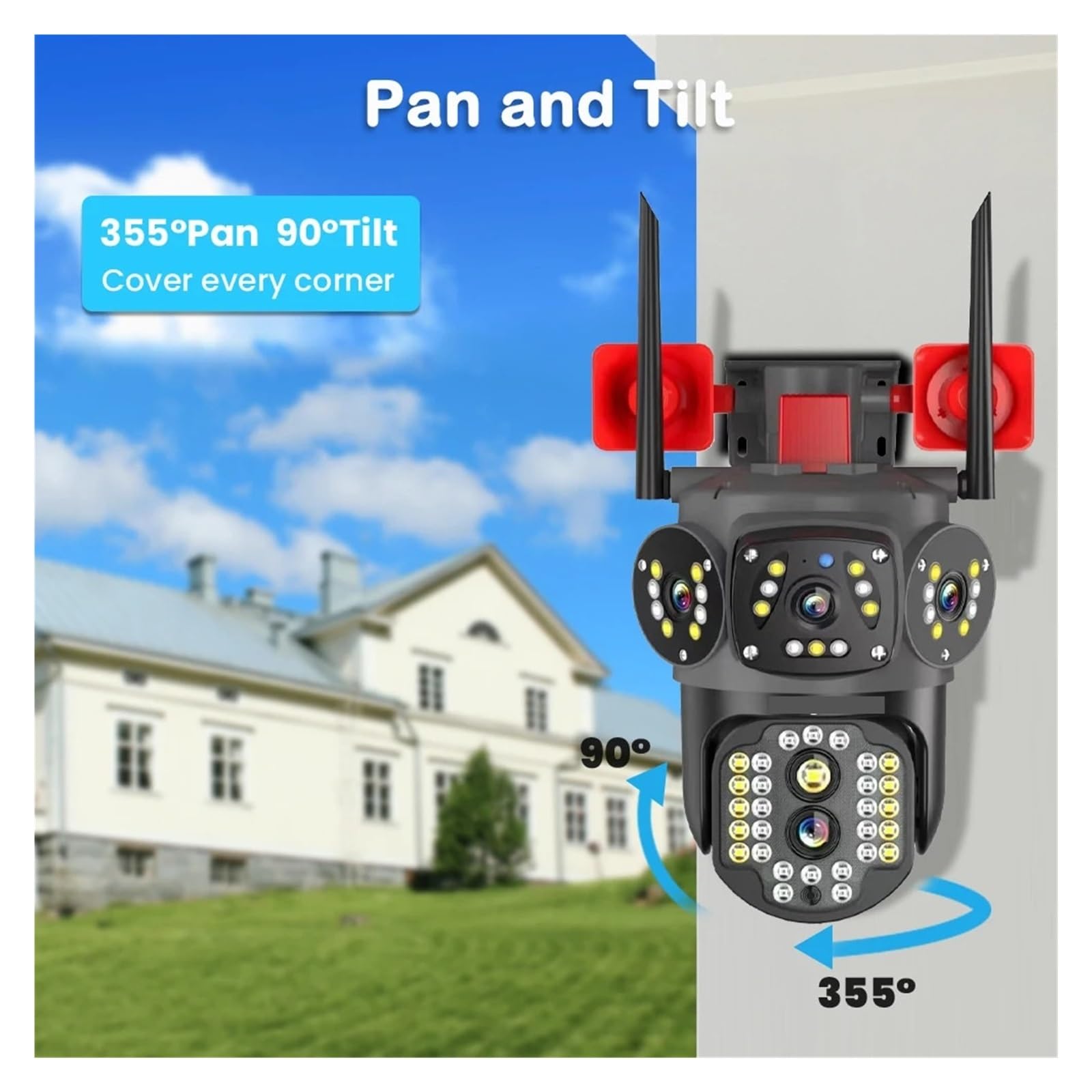 Main features * 800 million pixel 4K ultra-high-definition resolution for real-time viewing; * Supports memory card (up to 128G) and cloud storage; * Supports motion detection, and will push alarm information to the mobile application; * Supports horizontal and vertical rotation, with rotation angles of 350 degrees and 90 degrees respectively; * Supports two-way audio, allowing calls and listening to be made through the application at any time and any place; * Supports red light/colored/smart night vision, and the modes can be switched in the device settings; * Waterproof rating of IP65, suitable for use in indoor and outdoor environments; * Two lenses with three screens. ========== Zoom type: Digital zoom Zoom ratio: 10 times Lens quantity: Dual lenses Artificial intelligence function: Motion detection Night vision function: Supported Dust and water resistance level: IP66 Power mode: AC power supply Applicable scenarios: Indoor and outdoor Pixel: 8 million pixels TF card: None Power supply: Normal Internal storage: None Installation method: Wall-mounted, hanging Video compression format: H.265 Red light line transmission distance (meters): 15 - 25 meters Sensor: CMOS Supported operating systems: None Lens (mm): 4 mm Connection method: 2.4GHz WIFI HD: 8.0 megapixels Style: PT camera Special features: Waterproof / Windproof "Welcome to Security Camera Store" ✅ 10K ultra-high definition / four-lens panoramic / AI tracking camera coverage, from home security to commercial surveillance, professional solutions protect every inch of your safety! Click to explore → Smart Security Cutting-edge Technology, making surveillance not just about "seeing", but also about "anticipating" risks!▷ 10K UHD resolution (2.5 times the clarity of 4K) ▷ Four sensors + four-screen synchronized monitoring technology ▷ WiFi6 + dual network port stable transmission solution ▷ Military-grade IP65 waterproof and dustproof craftsmanship