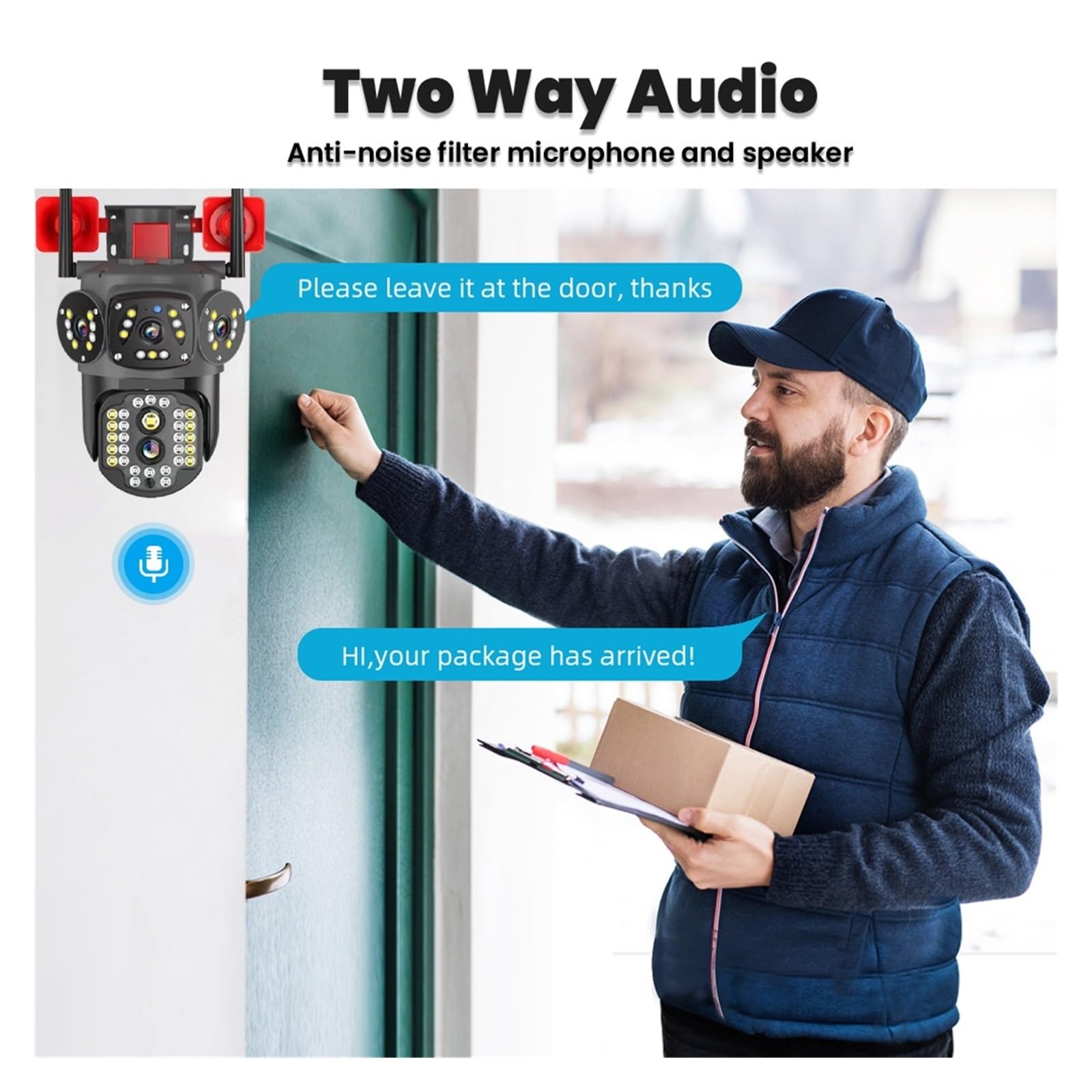 AI motion detection + two-way voice, smarter security: accurately identify moving targets and push real-time alarm alerts to avoid false alarms; built-in high-fidelity microphone and speaker,无障碍远程双向语音沟通, can respond to visitors or warn intruders at any time.