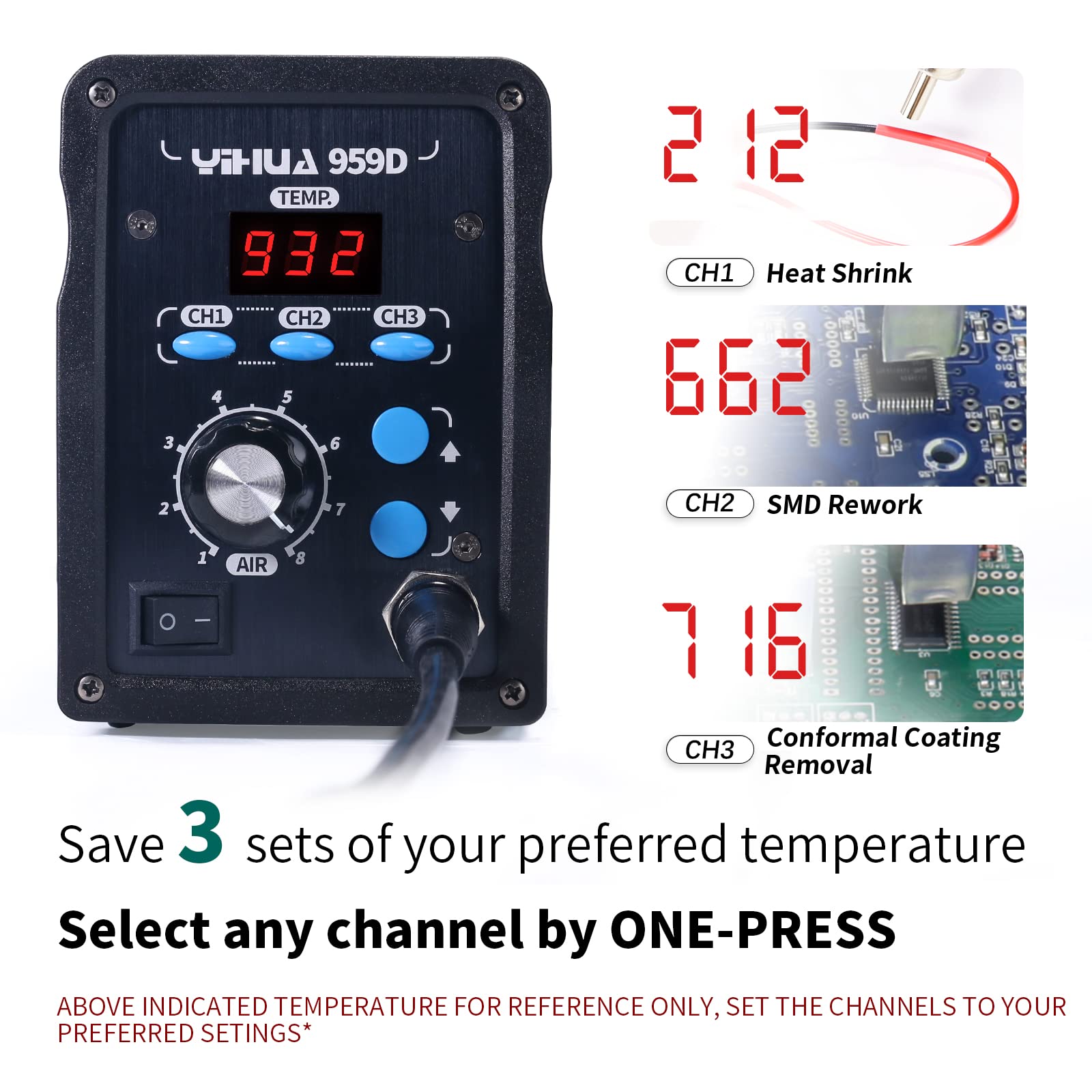 3 Preset Channels – Save your regularly used settings into three preset channels and jump between channels with just one press. You no longer have to adjust the temperature over and over just for components and solders with different temperature parameters.
