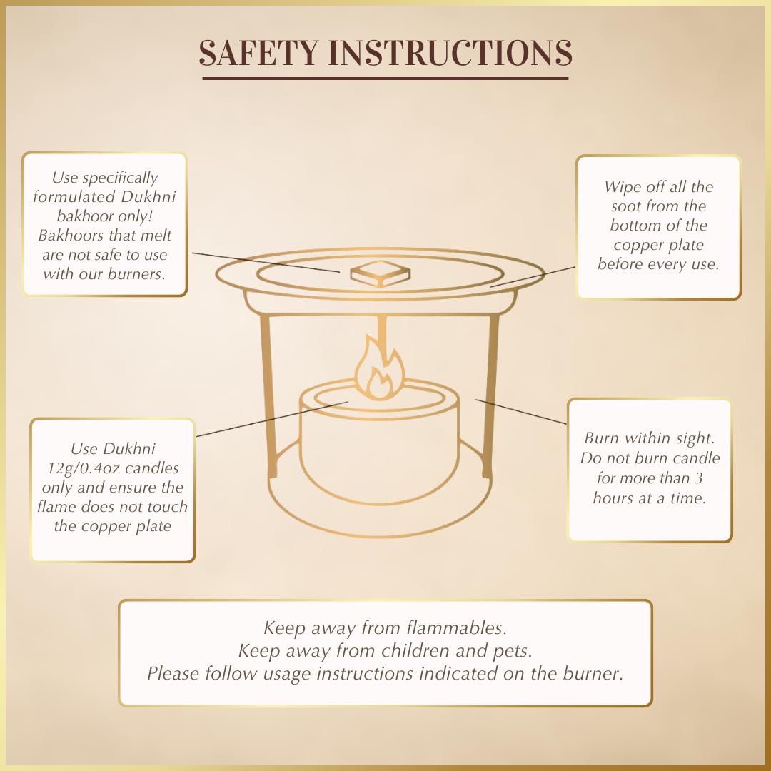HOW TO USE: To set up the signature burners; place the metal burner on the wooden coaster and the copper plate above the burner. Simply place a piece of bakhoor on the copper plate and light the tealight candle below. Only use tealight candles with a 3.5 hour burn time. The scent will steadily diffuse without smoke ensuring its longevity. In an unventilated room, the aroma of the bakhoor will spread to about 400 square feet. Dukhni Bakhoor also burns well the traditional way on charcoal.