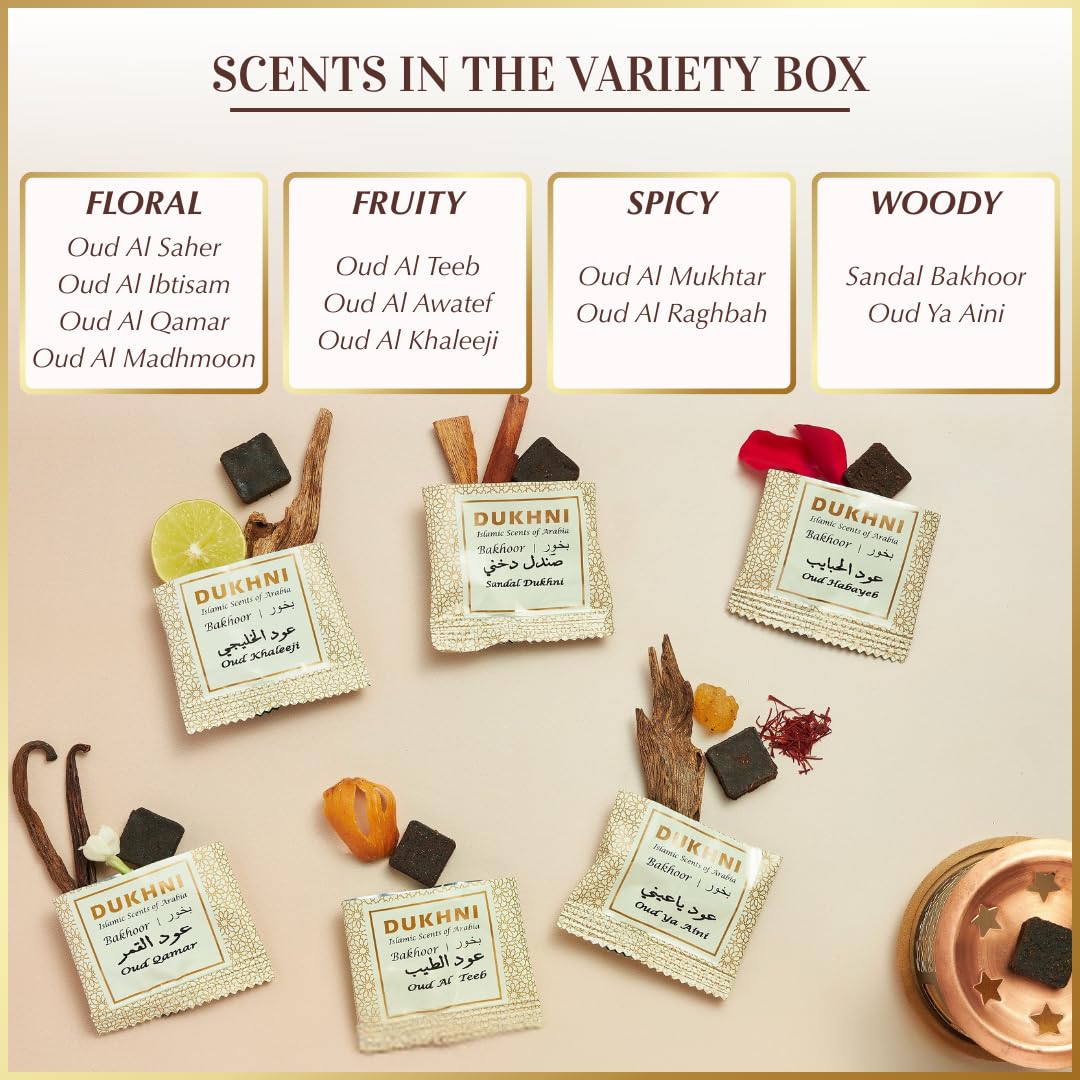 CONTENTS: 10 fragrances of Oud Bakhoor x 2 pieces each with a Rainbow Exotic Bakhoor Burner & 1 tealight candle