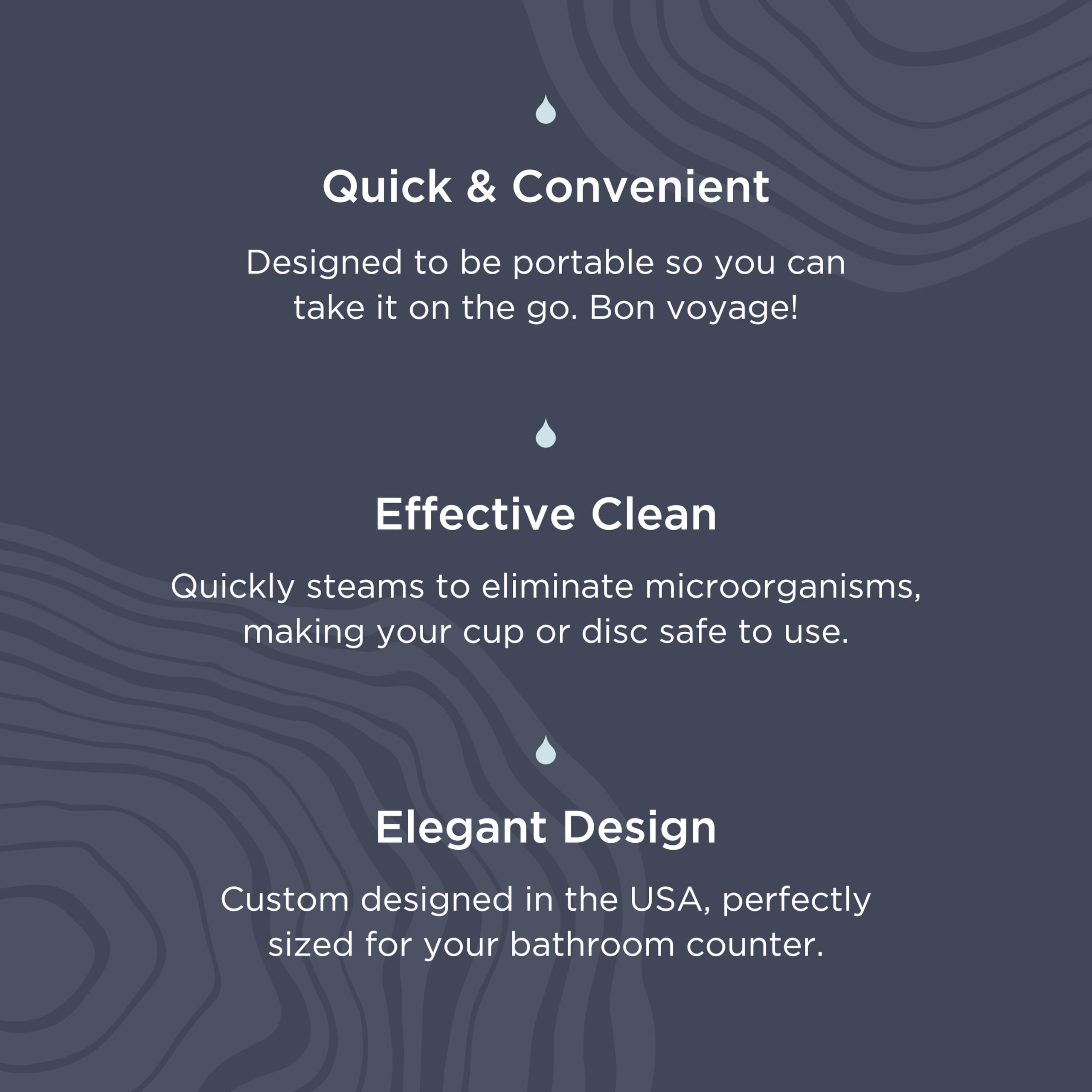 NO BOIL, NO BURN, NO MESS: The period cup sanitizer is perfect for those who want to avoid stovetop sterilizing. Just add water, press the button, and you’re done—an efficient way to clean your cup or disc that saves time and simplifies your self-care.