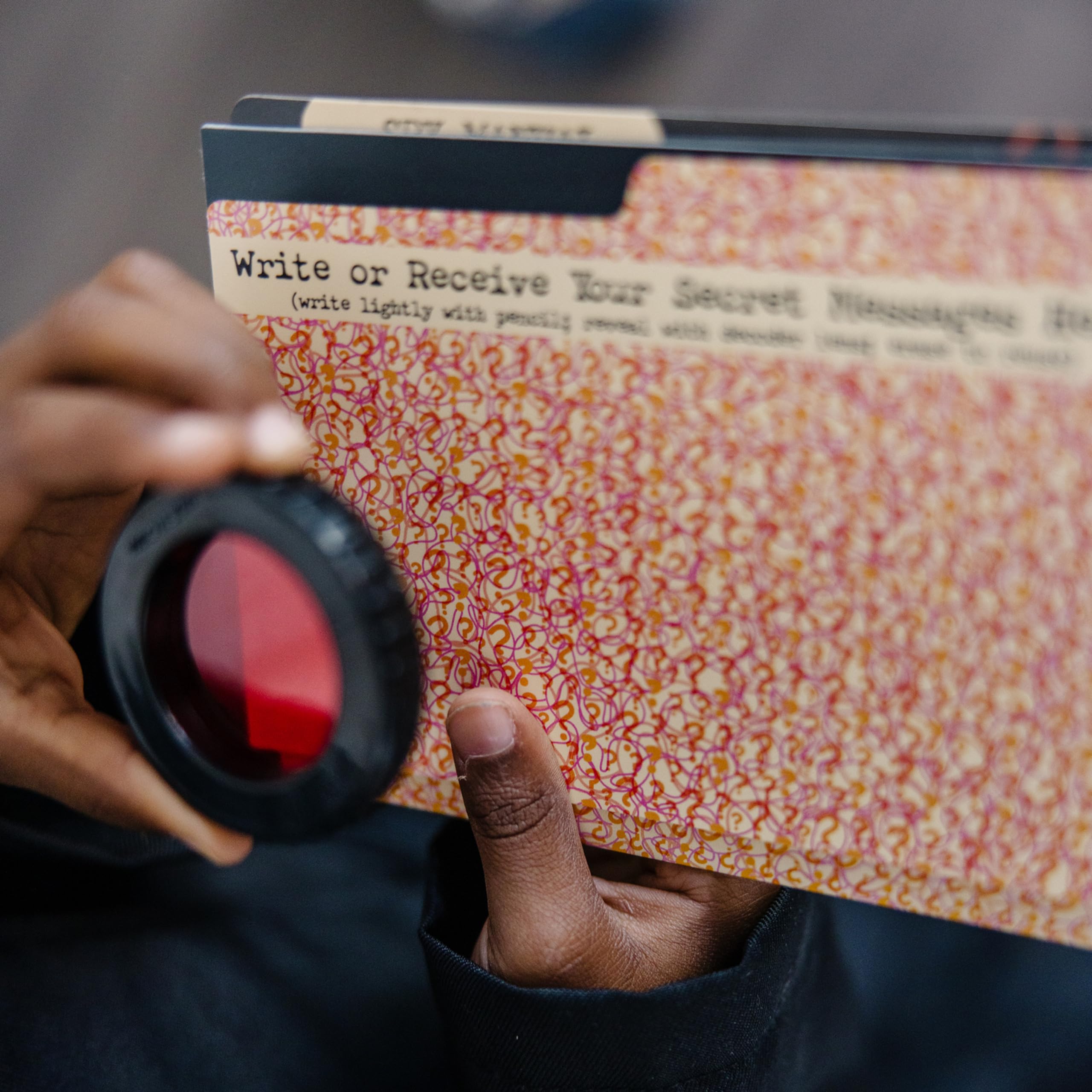 Includes black spy jacket, hat, rear-view mirrored sunglasses, secret coded message card, decoder lens, spy guide