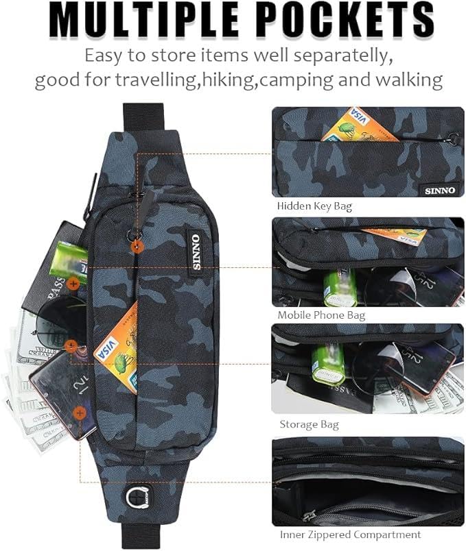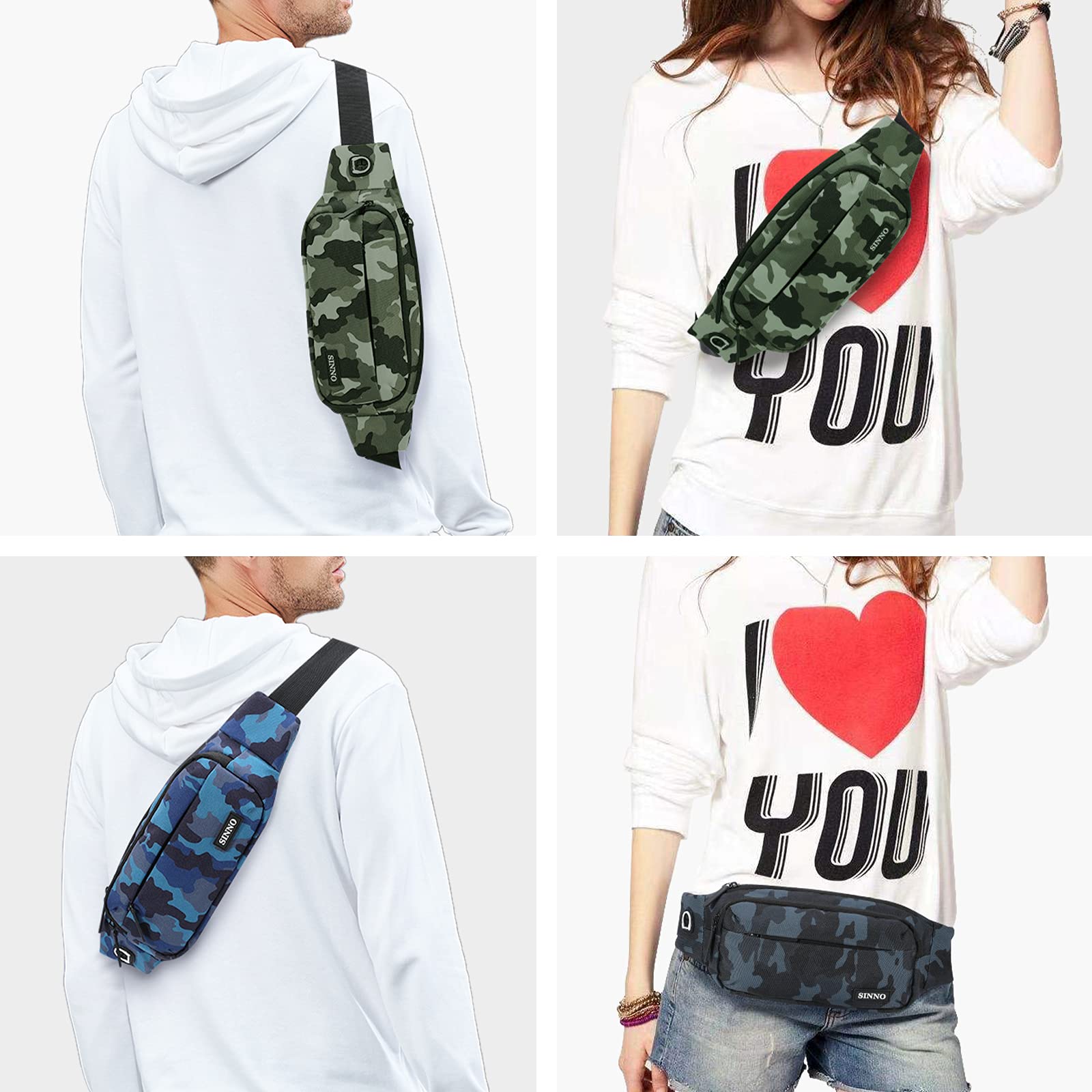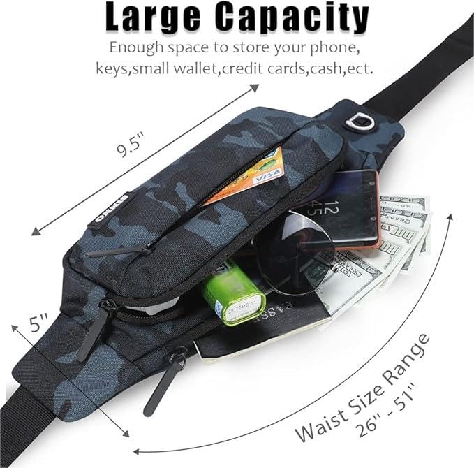 【Best Gifts for Men Women】Our camo fanny pack size is about 13.5"x 5" x 3.5" with 4(Four) zippered pockets perfect for most people who want to be hands free to carry the most needed items,include all size of phone(iphone 13 14 pro max...), passport, keys,ID and other travel essentials. Perfect for various outdoor activities such as Running,Hiking,Shopping,Traveling,Walking Dog,Jogging,Cycling,Fishing,Going to Sporting Events,Themepark,Day Trips,etc.A great Gift for Women Men Kids and Family.