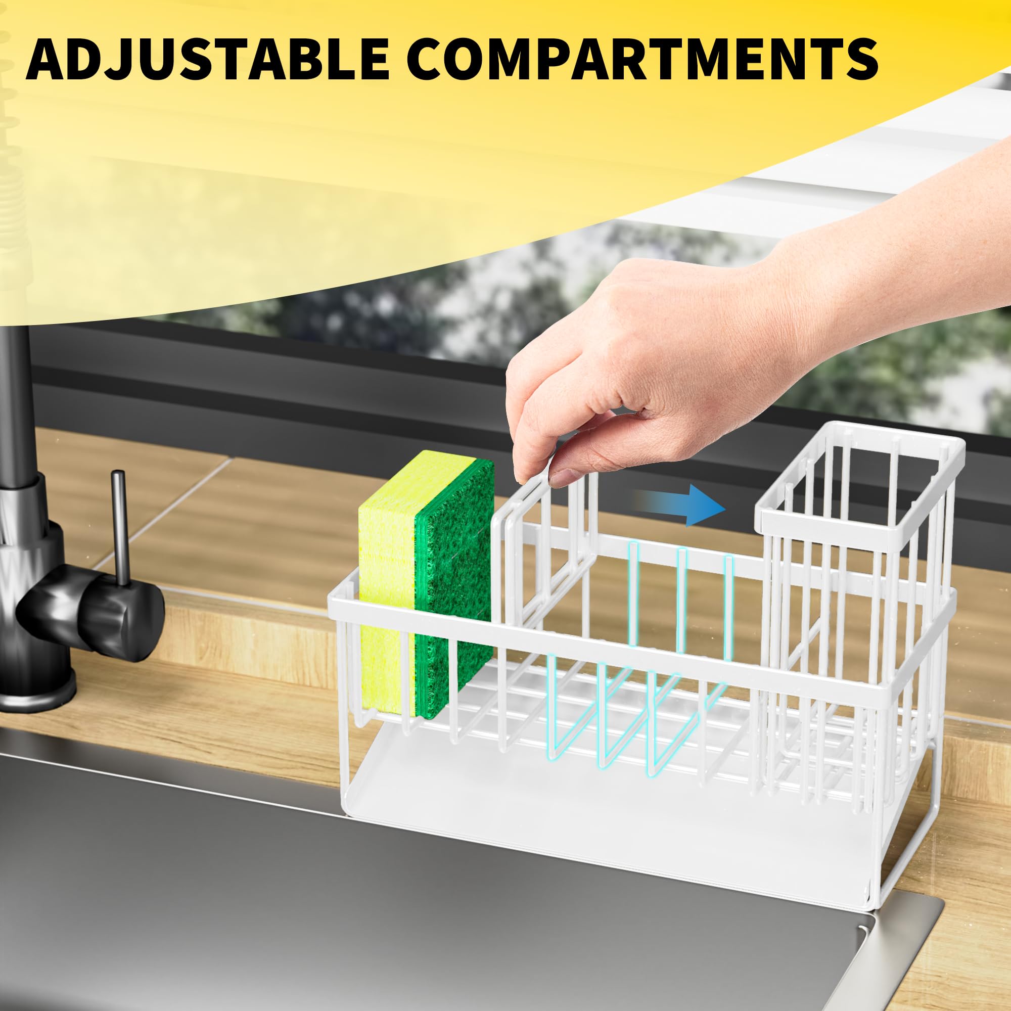 【REASONABLE DIVIDER DESIGN】 The sponge holder for kitchen sink ergonomic divider design allows it to have 3 separate storage spaces, Different items are placed in different areas. Make the most of every inch of space and make your kitchen look cleaner.