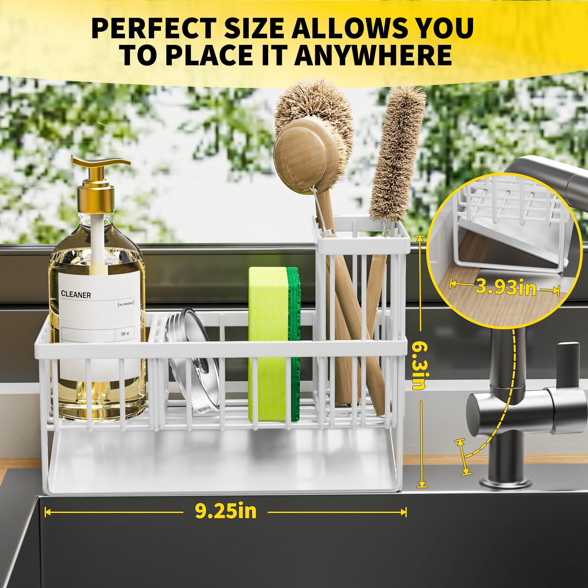 【SMALL VOLUME】 Cisily sponge holder is suitable for kitchens with limited space. It measures only 9.25"*3.97"*6.37", Holds a detergent bottle, a sponge ball and sink stopper. With an extra upgraded brush holder that can hold up to 4 small and large sized brushes, with the Cisily Sink caddy you can save countertop space perfectly.