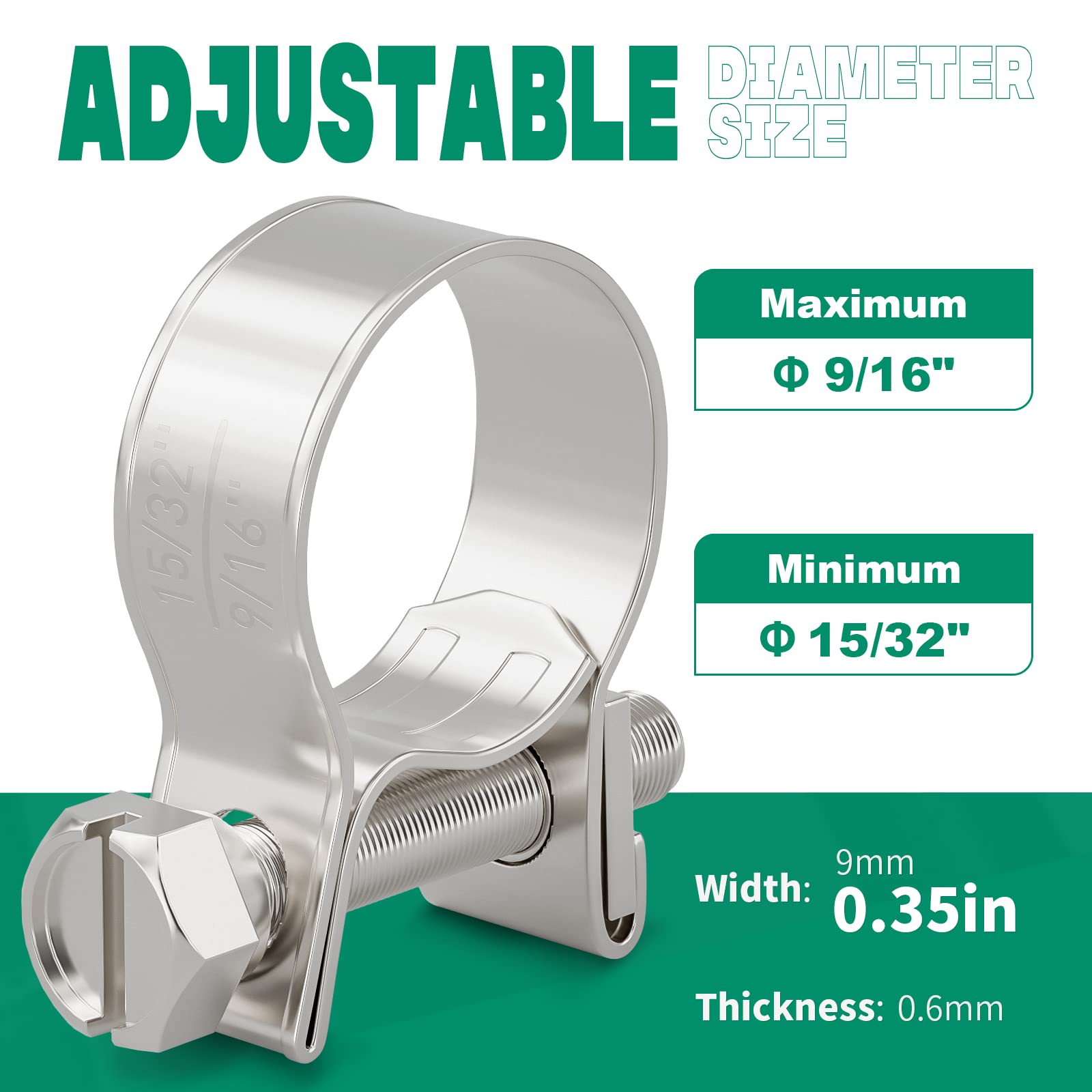 OURU Fuel Line Hose Clamp:Our 20pcs gas line clamps with adjustable screws,features flexible adjustability,freely adjustable size range is 15/32"-9/16" (12-14mm). The size standard has no deviation,which can meet your daily needs for products of different size