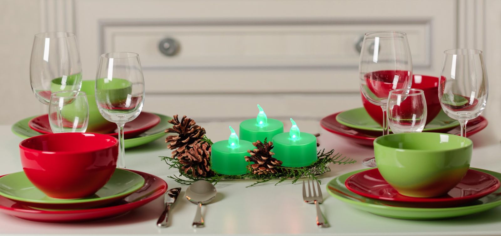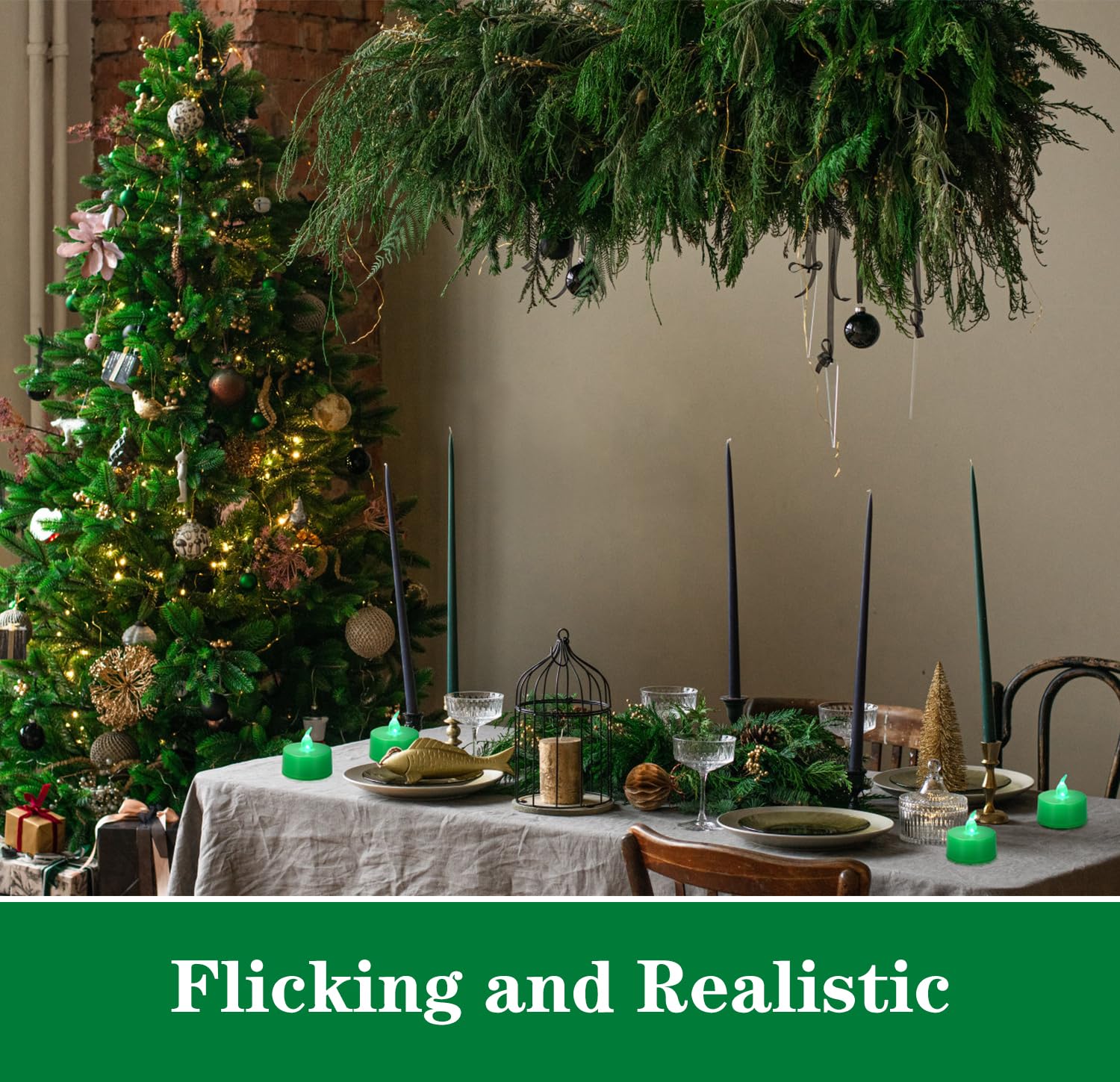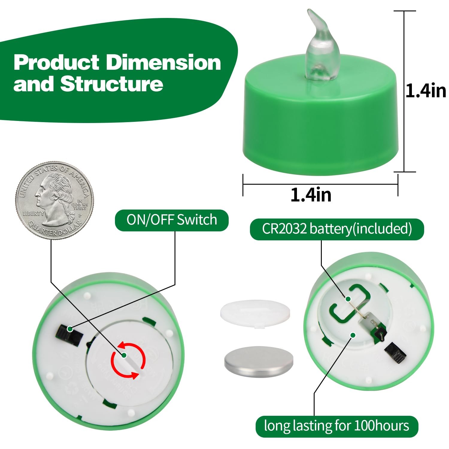 Specifications: Item name: Flameless tea lights Material: PP Tea light size: 1.4 x 1.4 x 1.4in Tea light weight: 0.3oz/piece Light color: Green Light effect: Flickering Switch mode: Manual switch Battery: 1pcs CR2032 per light(included) Working time: 100H+ Package List: 24 × Flameless tea lights(green light, green base)