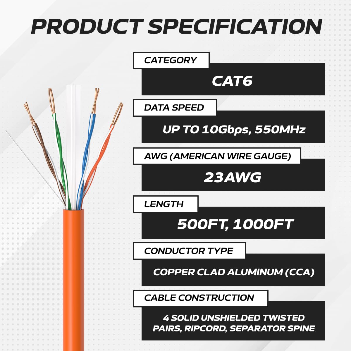 Reliable Signal Transmission: Our Cat6 1000ft CCA Cable features color-coded twisted pairs, effectively minimizing interference and ensuring a stable and clear signal transmission even in noisy environments.